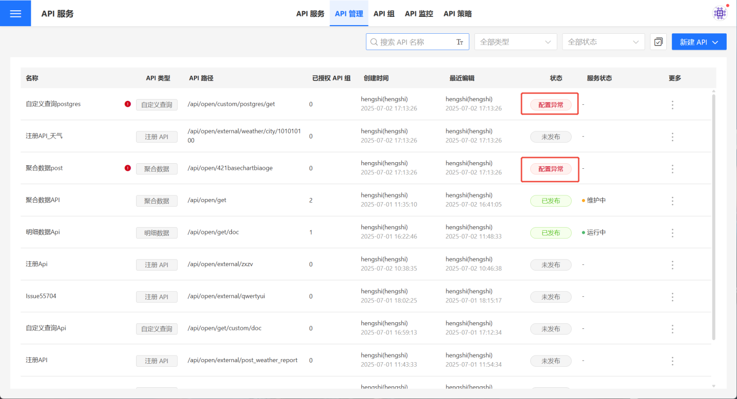 已导入,配置异常的 API,可能是某些配置发生异常,需要修改。如图所示的 API,导入后因为原有的图表或数据集不存在,显示配置异常,需要对异常项重新配置。修改后 API 是未发布状态,测试后进行发布。