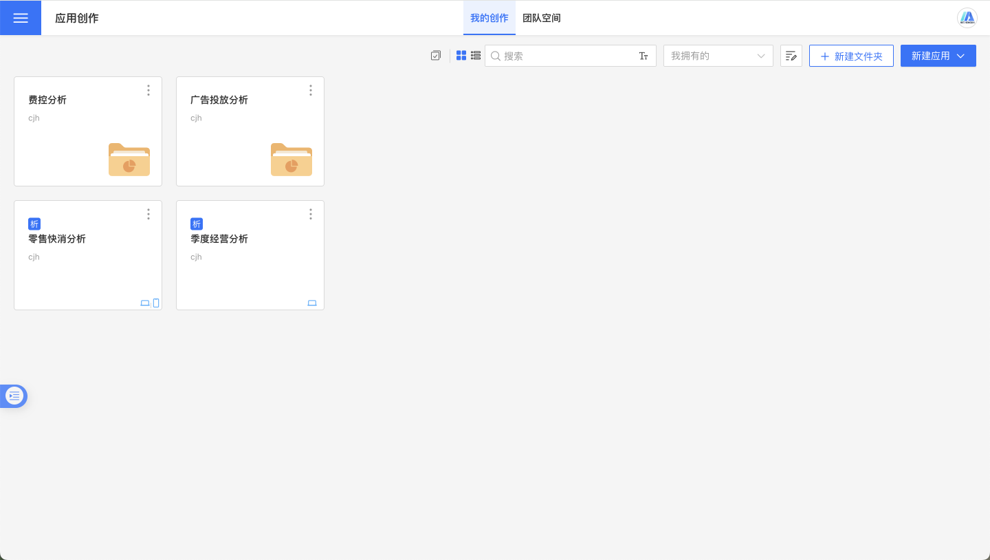 - 我的创作:是个人创作区域,每个具有数据分析的角色的用户都拥有该空间,能够在该空间进行应用创作