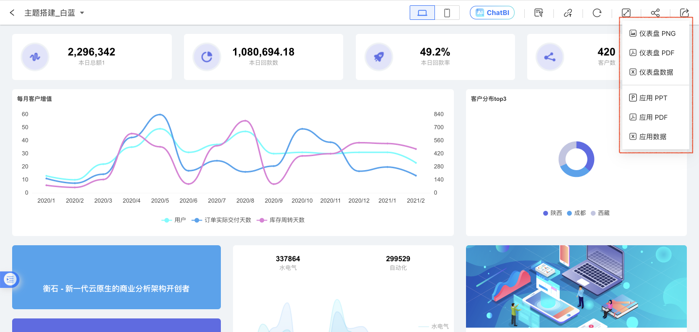 当开启导出数据功能后,应用发布后可以导出 PPT、PNG、PDF、数据等多种格式,包括图表的聚合数据以及明细数据。