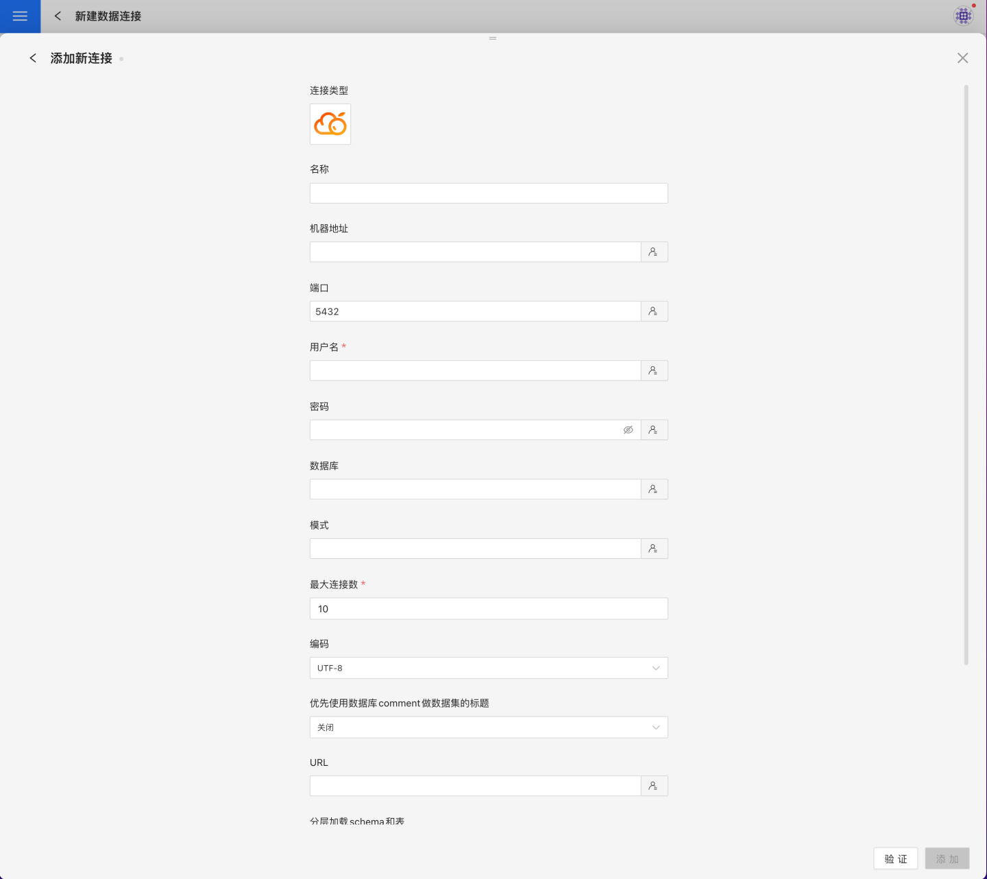 字段 说明 名称 连接的名称。必填,且用户内唯一 机器地址 数据库的地址。如果填了 url 字段,优先使用 url 里面的 端口 数据库的端口。如果填了 url 字段,优先使用 url 里面的 用户名 数据库的用户名 密码 数据库的密码 数据库 数据库名称 模式 数据库的schema 最大连接数 连接池最大连接数 编码 数据库连接的编码设置 优先使用数据库 comment 做数据集的标题 优先显示表的名字还是表的注释。开启时显示标题,关闭时显示表注释 URL 数据库的 jdbc url 分层加载 schema 和表 默认为 关闭。开启时分层加载 schema 和表,连接过程只加载 schema,需要点击schema才会加载schame下的table 查询超时时间(秒) 默认为 600. 当数据量较大时,可以适当增加超时时间 允许写入操作 表示该连接可以在数据集成,批量同步中选择为输出连接。需要有对数据库有写权限且验证通过后,才能配置该参数。 支持上传文件到指定路径 表示新建本地文件数据集时, 生成的表存放的数据库名称。需要有对数据库有写权限验且证通过后,才能配置该参数。 只显示指定数据库/模式下的表 该项选中时并且 database 字段不为空,则只显示该 db 下面的表 填好参数后,点击