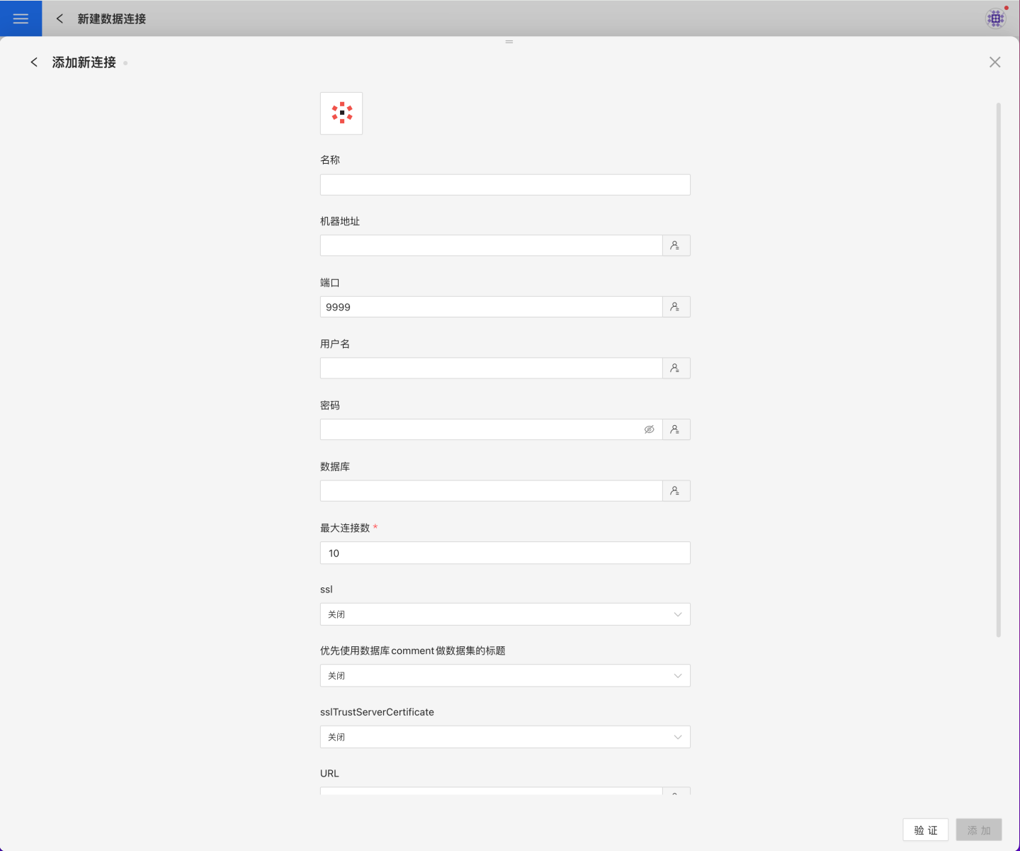 验证按钮,获取验证结果(验证 HENGSHI SENSE 和设置的数据连接的连通性,在未验证通过时不可添加)。验证通过后,点击