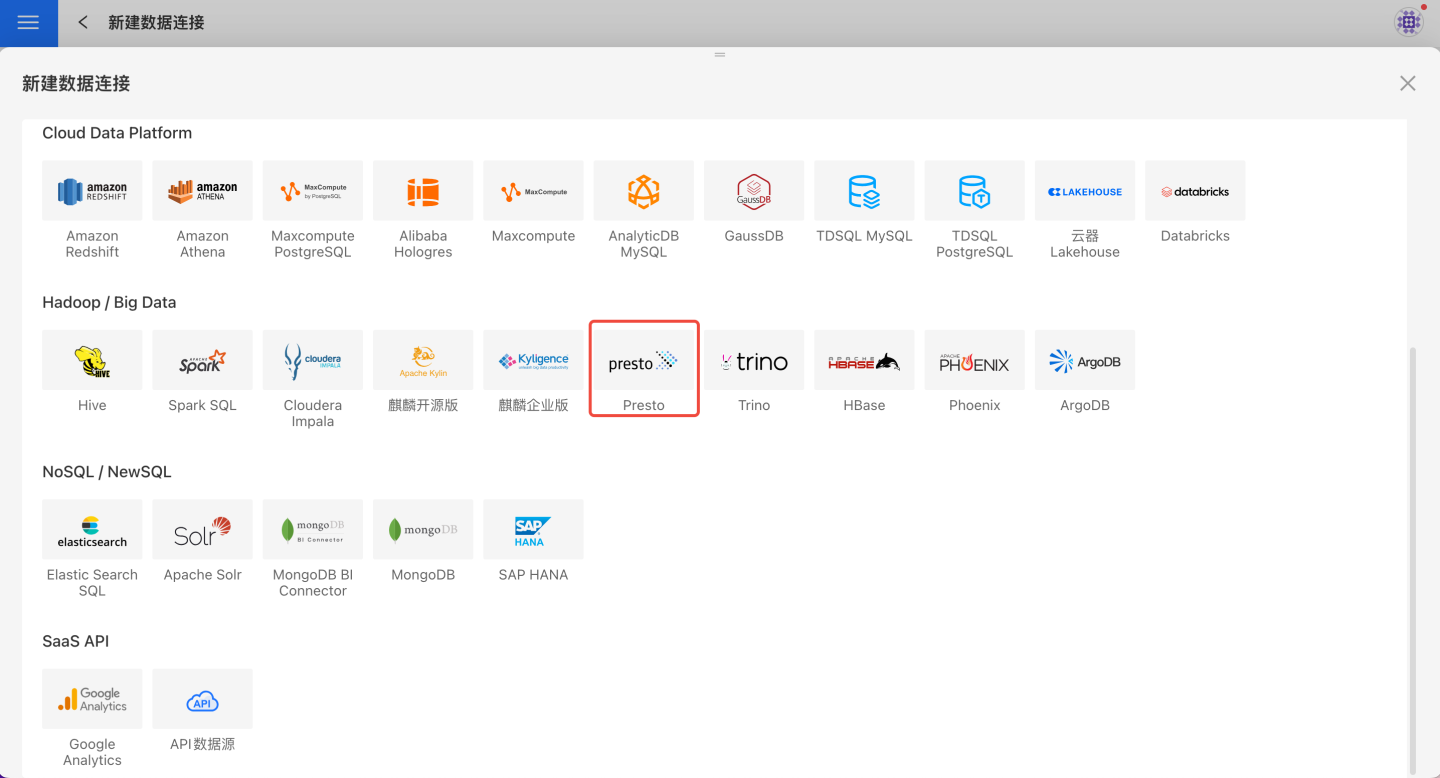 请参照如下步骤连接 Presto 数据源。