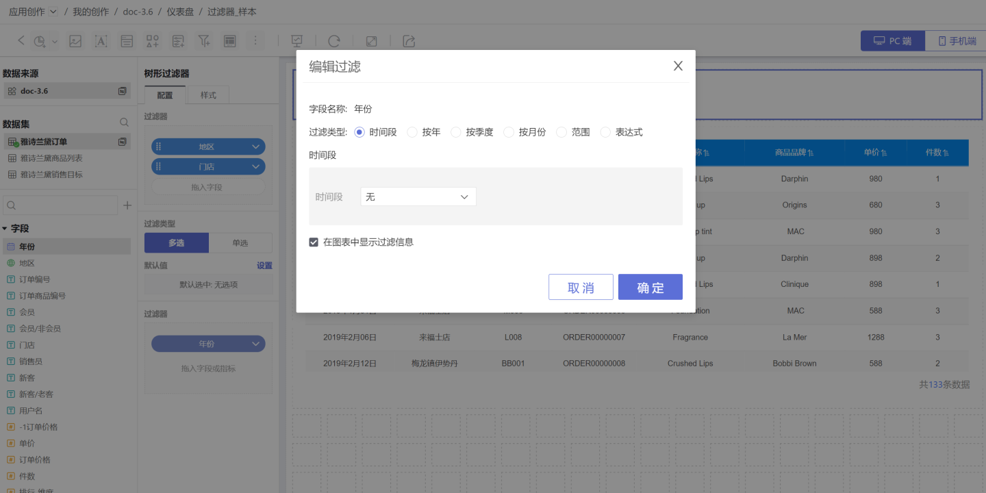 内部过滤器可以设置是否在图表中展示过滤信息,当勾选该项后,打开图表的时候会显示该信息。