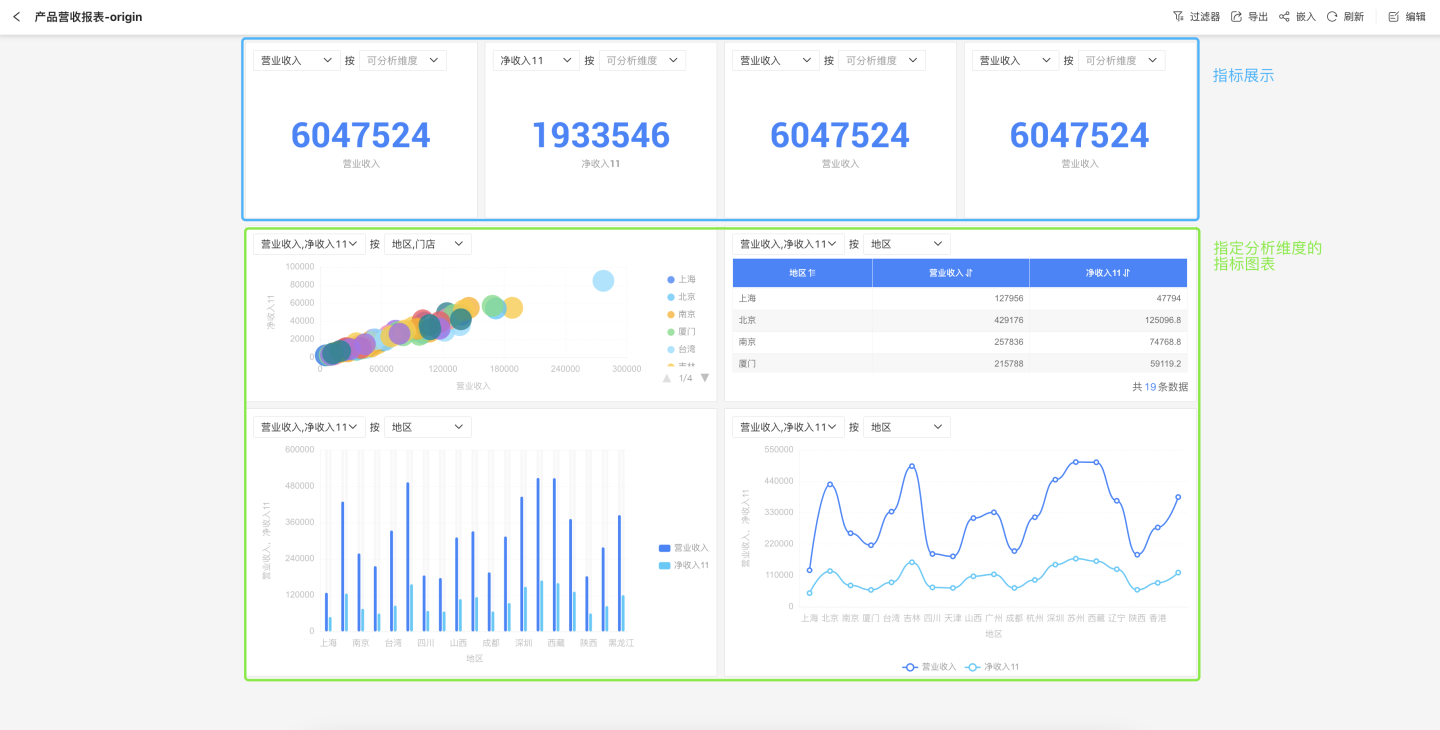 看板可以将业务指标包含丰富的业务信息通过各种图表展示出来,如图所示,营业收入和净收入两个指标通过指定分析维度、筛选过滤信息,可展示总体 KPI 收入,各类产品的 KPI 收入,高、低端品类中各商品的营业收入、净收入对比情况,高、低端品类近年来营业收入、净收入对比情况等等。