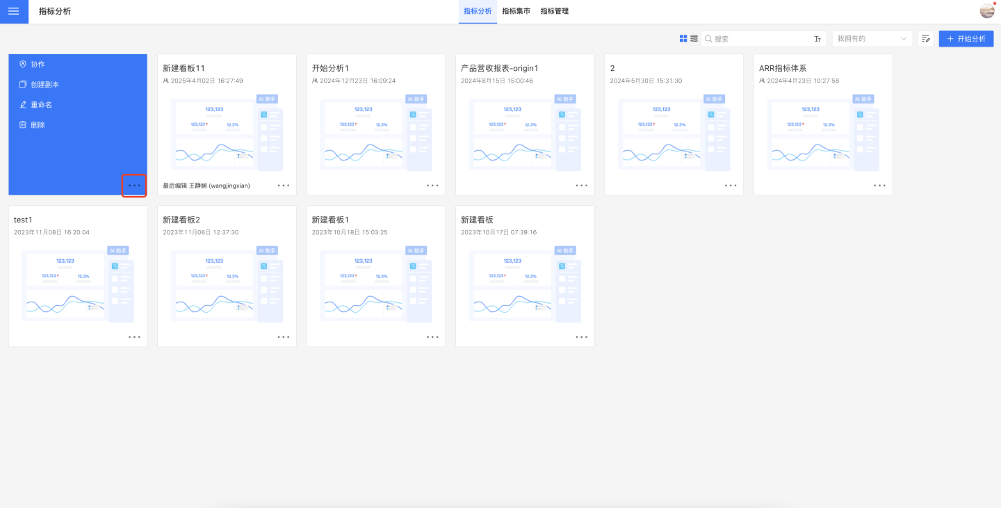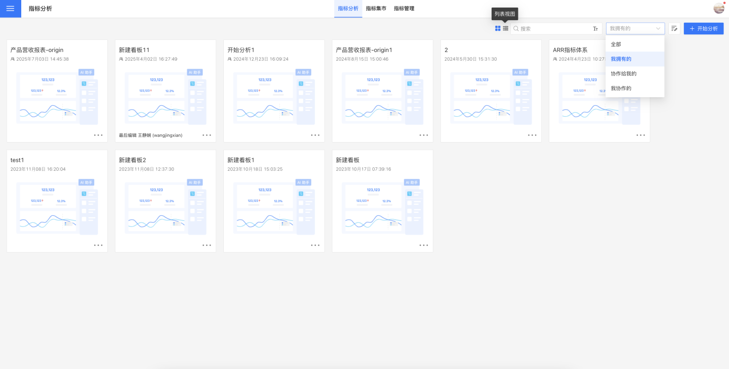 指标分析模块中展示所有看板,支持平铺、列表两种展示视图,支持搜索看板,分类查找看板,支持看板排序。