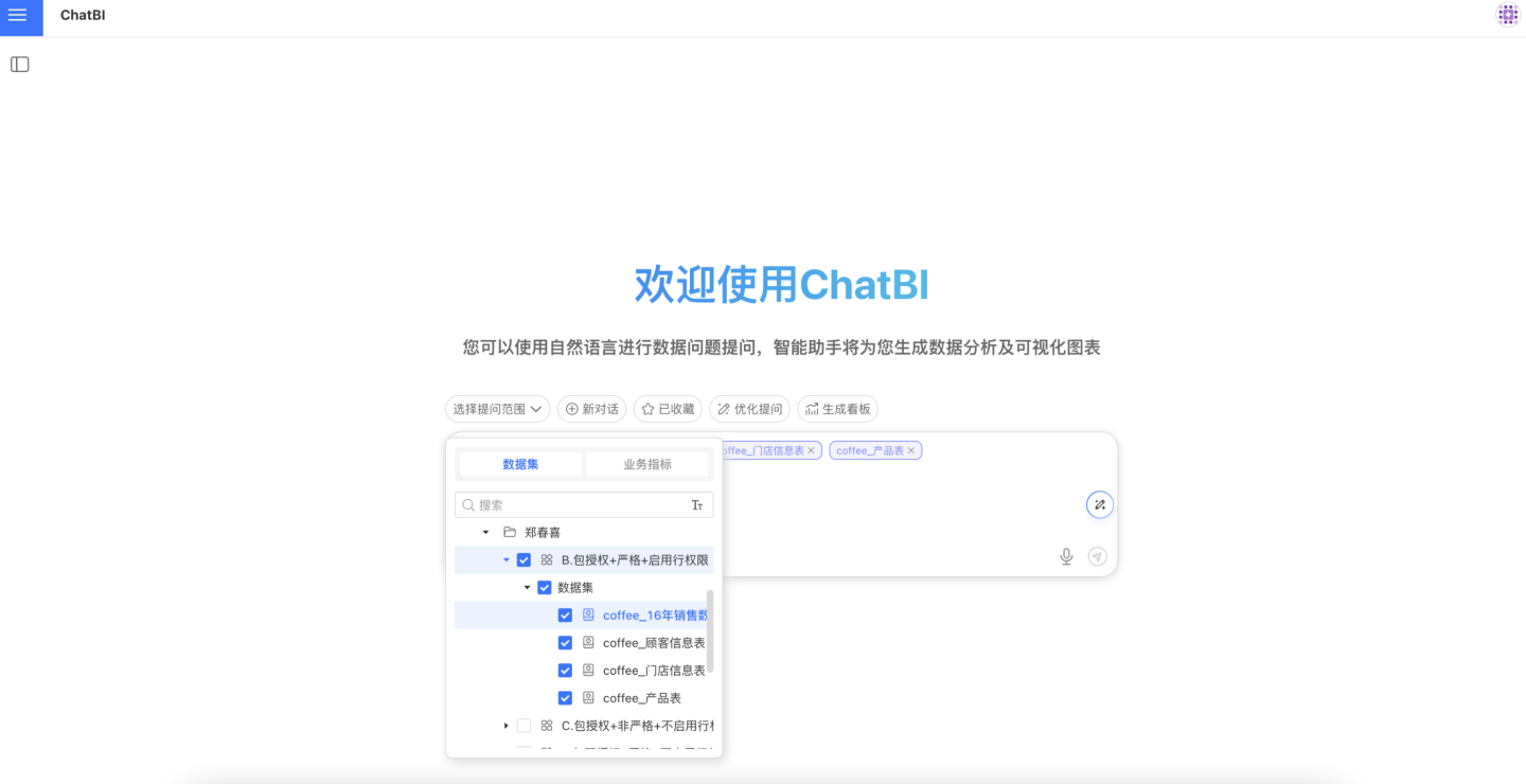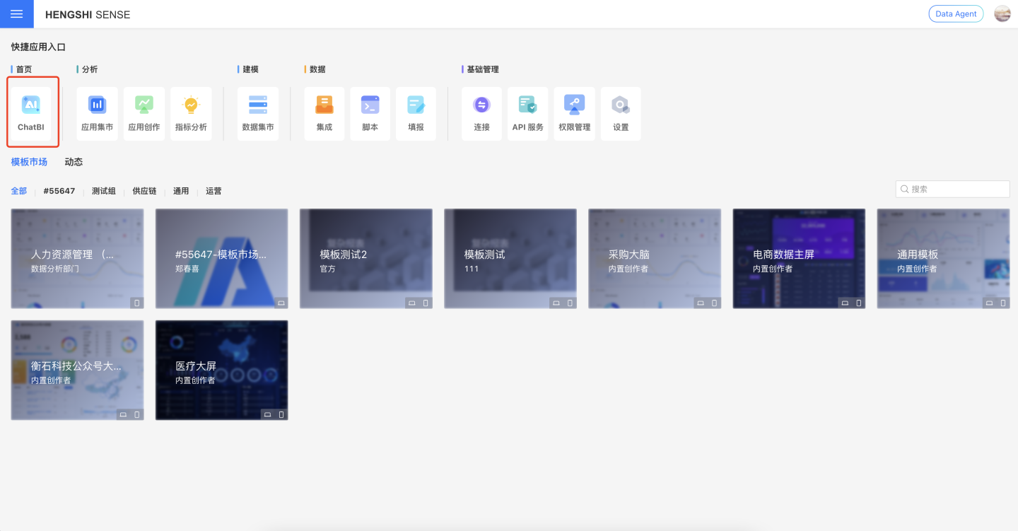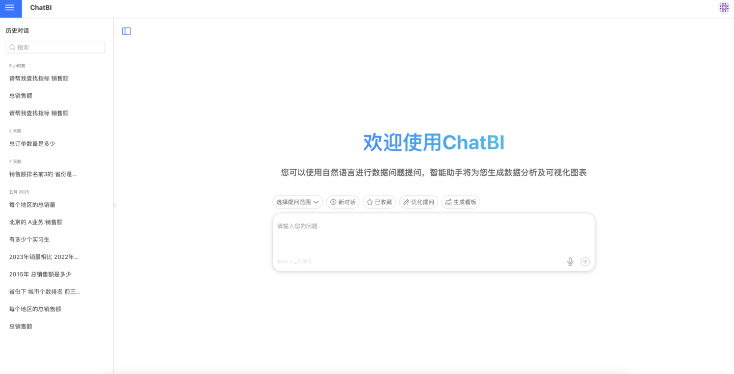 在系统首页的ChatBI一级入口,打开进入到独立的ChatBI智能问数页面。