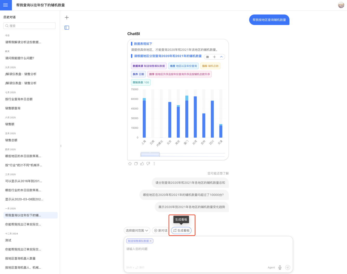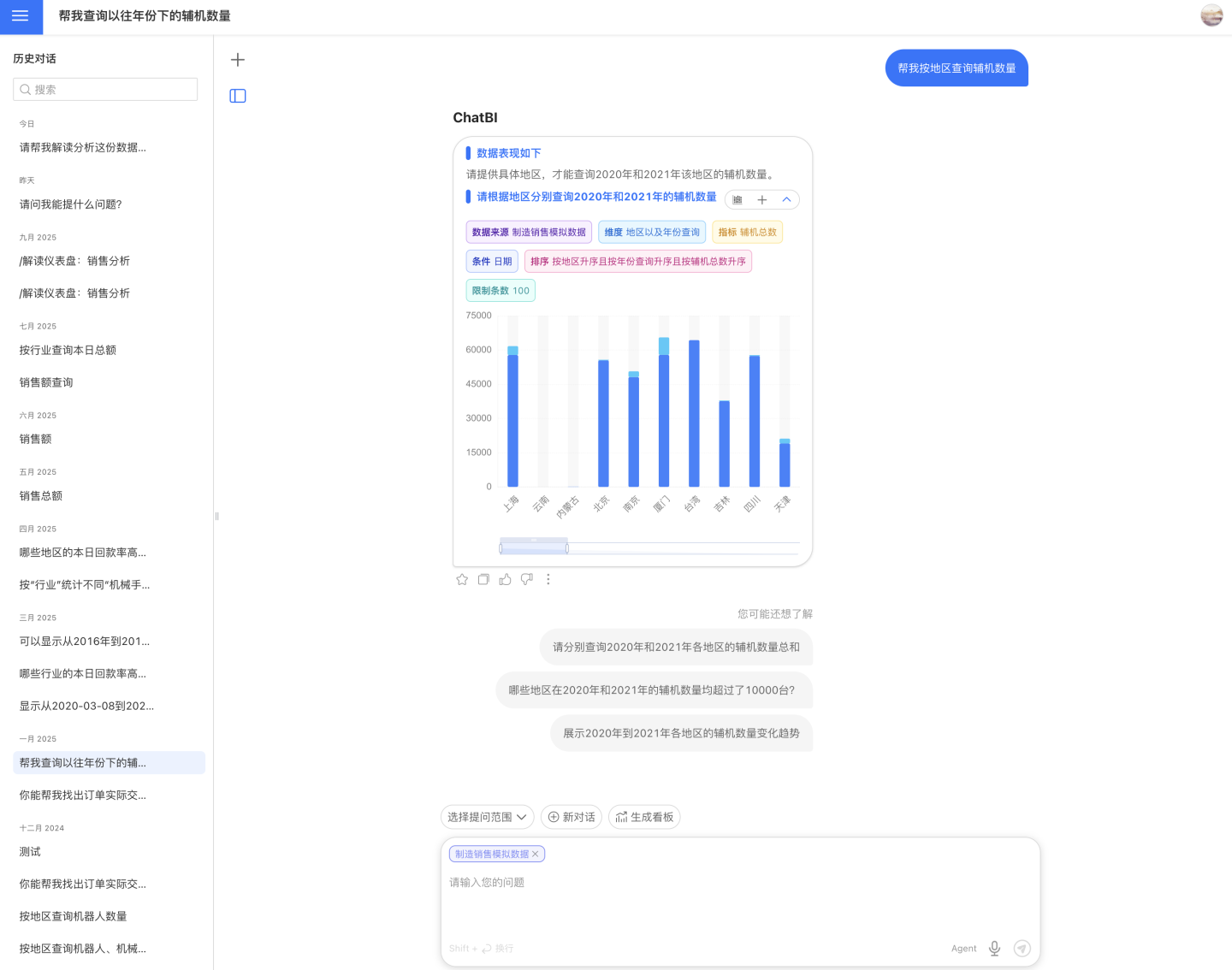 选择完提问范围后,可通过自然语言的方式进行提问,例如对制造销售数据提问“按地区查询辅机数量”,ChatBI 将会如下图进行回答,会返回相关数据并以图表形式呈现。