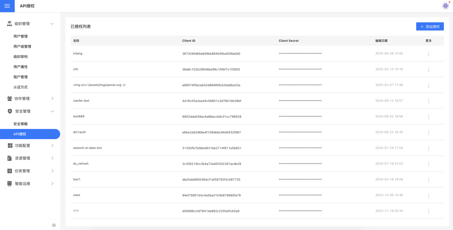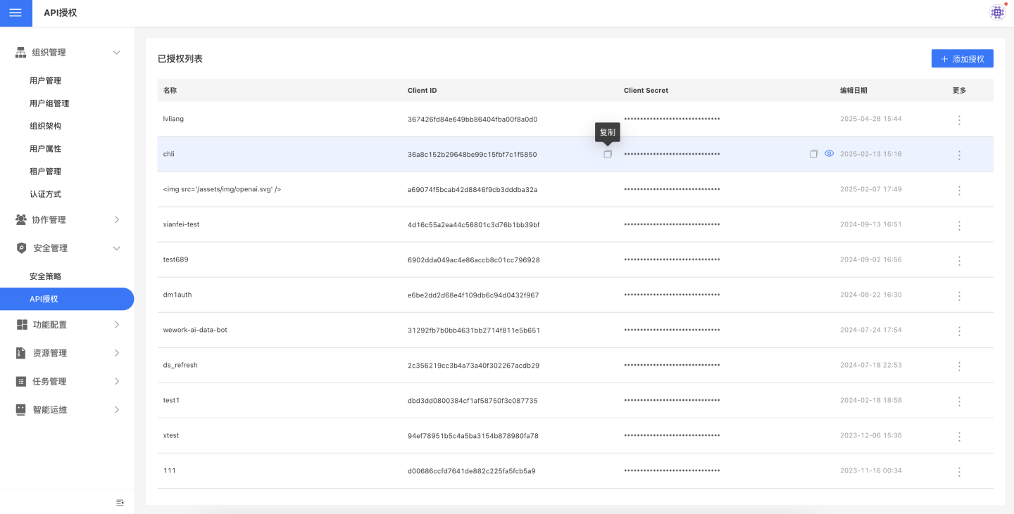 选择添加授权,在弹窗中输入授权名称,点击确定后就可以生成 Client ID 和 Client Secret。