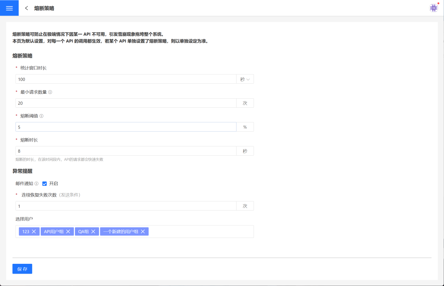 当 API 处于熔断状态时,会让该 API 的请求快速失败。到达熔断时长后,会对接下的 API 请求尝试恢复,如果该请求失败了,会继续开启熔断。如果连续多次尝试恢复 API 都失败了,此时可以考虑 API 处于异常状态,发送邮件进行异常提醒。