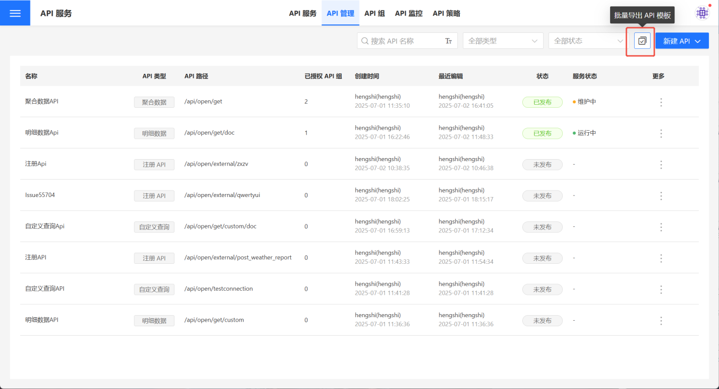 - 在API 管理中点击图中红色框,进入批量操作页面。