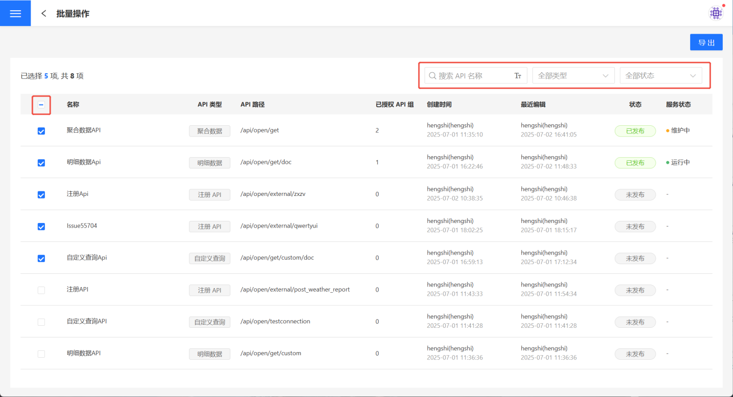 搜索、API 类型、发布状态快速筛选 API,然后在筛选结果中勾选需要导出的 API,支持全部勾选。