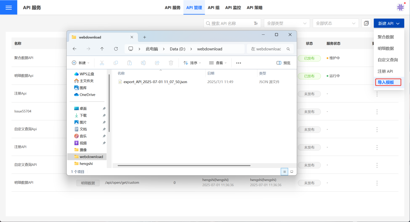 - 在API 管理中,点击新建 API->导入模板,然后选择 API 模板文件。