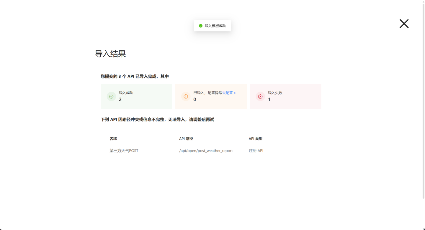 导入失败的 API,可能是因为 API 路径冲突或信息不完整,请修改后重新导入。 - 提示