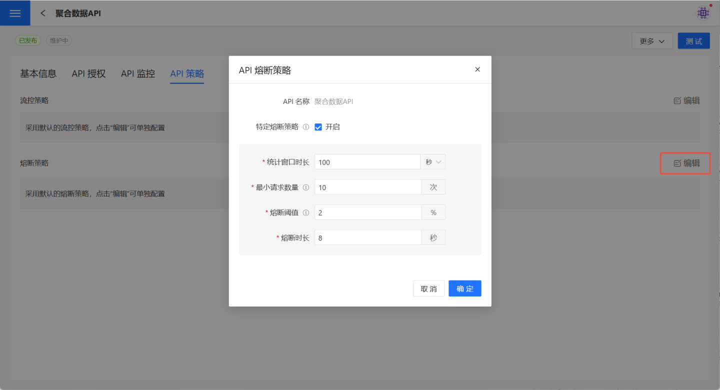 在API 管理->API 策略页面,点击熔断策略右侧编辑按钮,弹出 API 熔断策略页面,勾选开启按钮后,可以设置熔断规则,熔断参数的含义及作用请参考熔断参数说明。