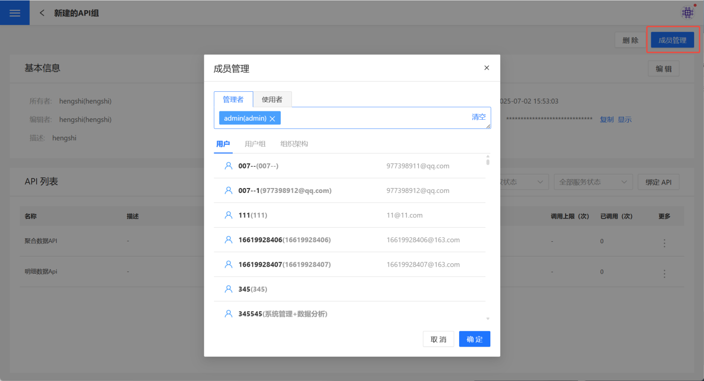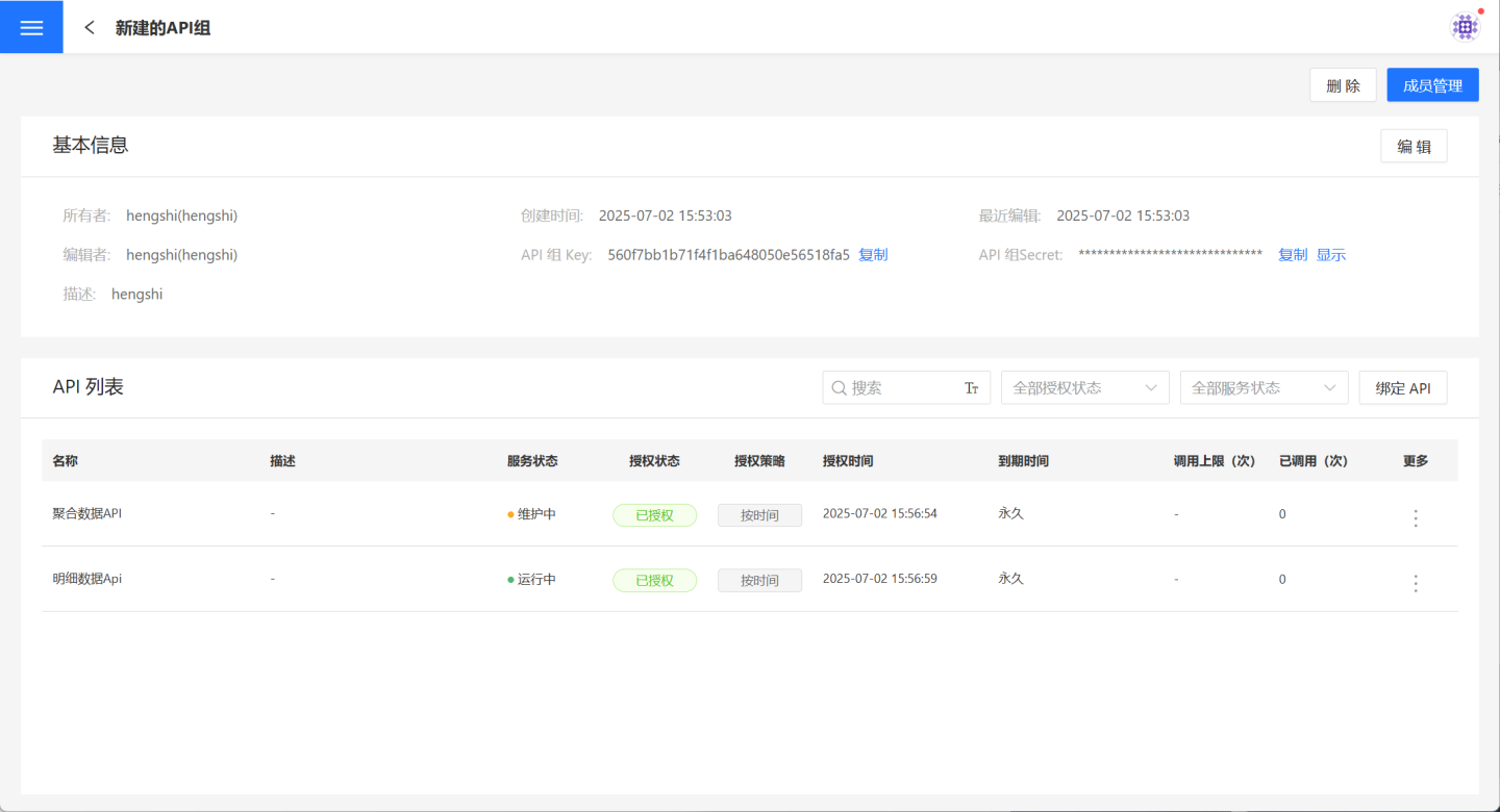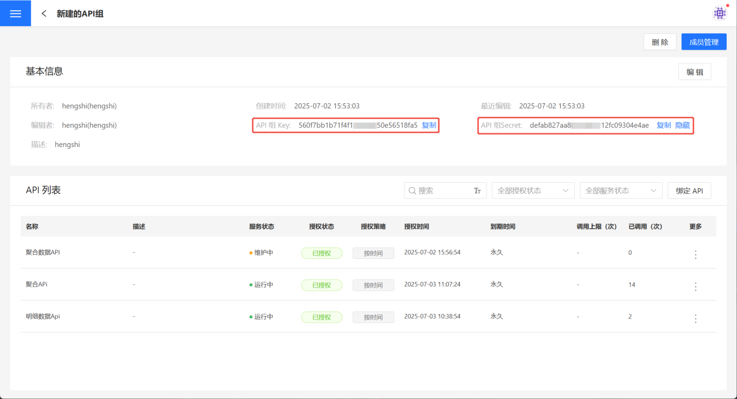 API 组所有者可以点击API 服务->API 组->API 组详情页->成员管理,将需要共同访问该业务领域数据的成员加入到本组。其中管理者可以对该 API 组进行包括删除在内的所有管理类操作,使用者仅可以查看该 API 组的信息,以获取访问该组 API 的鉴权信息以及调用各 API 时所必须的 URL 信息。