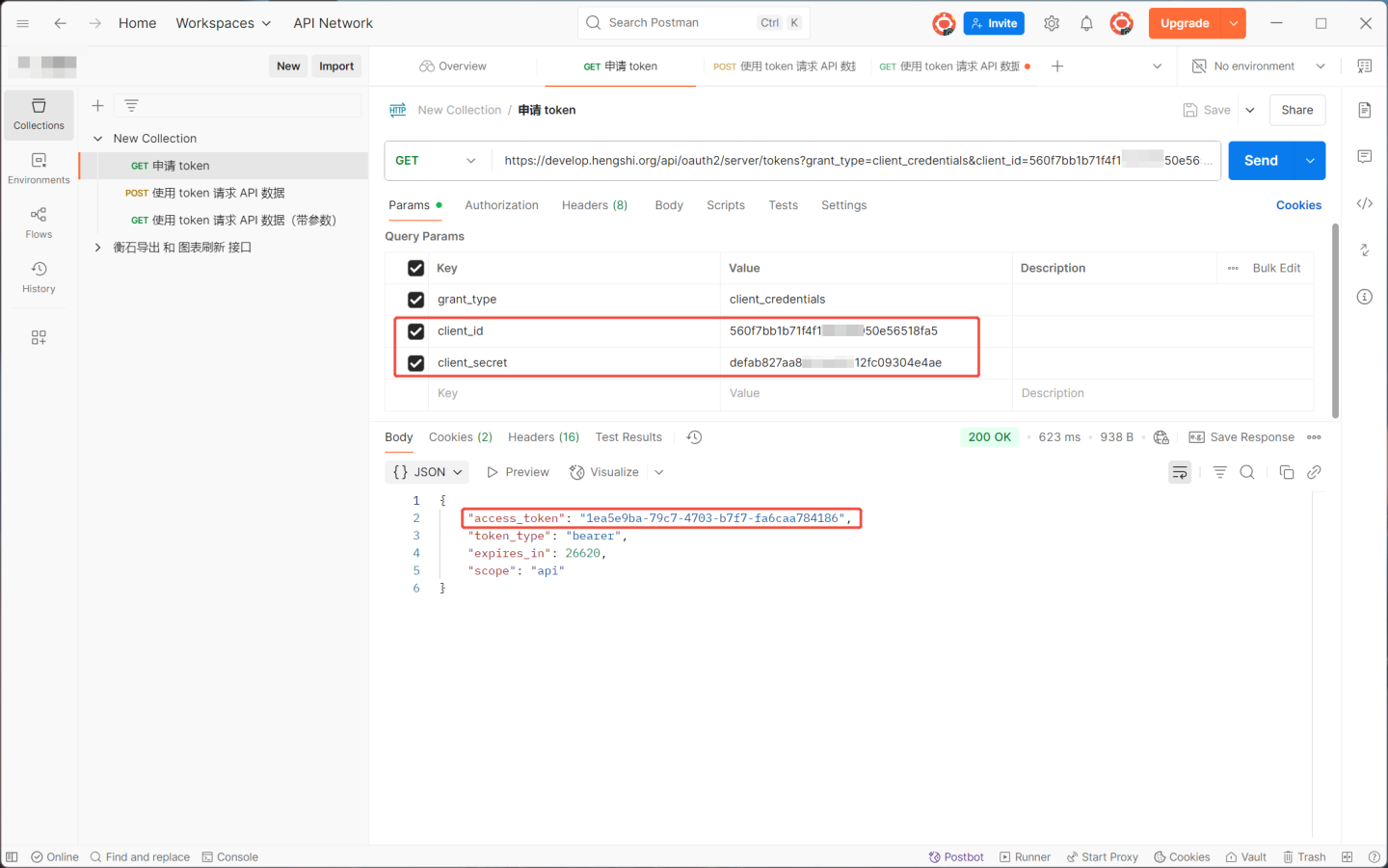 当 host 为https://develop.hengshi.org,使用上图中 API 组的 Key 和 Secret 拼出的 url 为https://develop.hengshi.org/api/oauth2/server/tokens?grant_type=client_credentials&client_id=560f7bb1b71f4f1******50e56518fa5&client_secret=defab827aa8********12fc09304e4ae在 Apifox 上获取 access_token。(说明:Apifox 将 url 中的参数进行了提取)