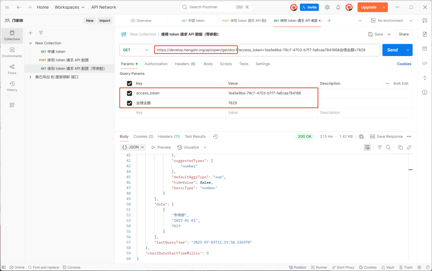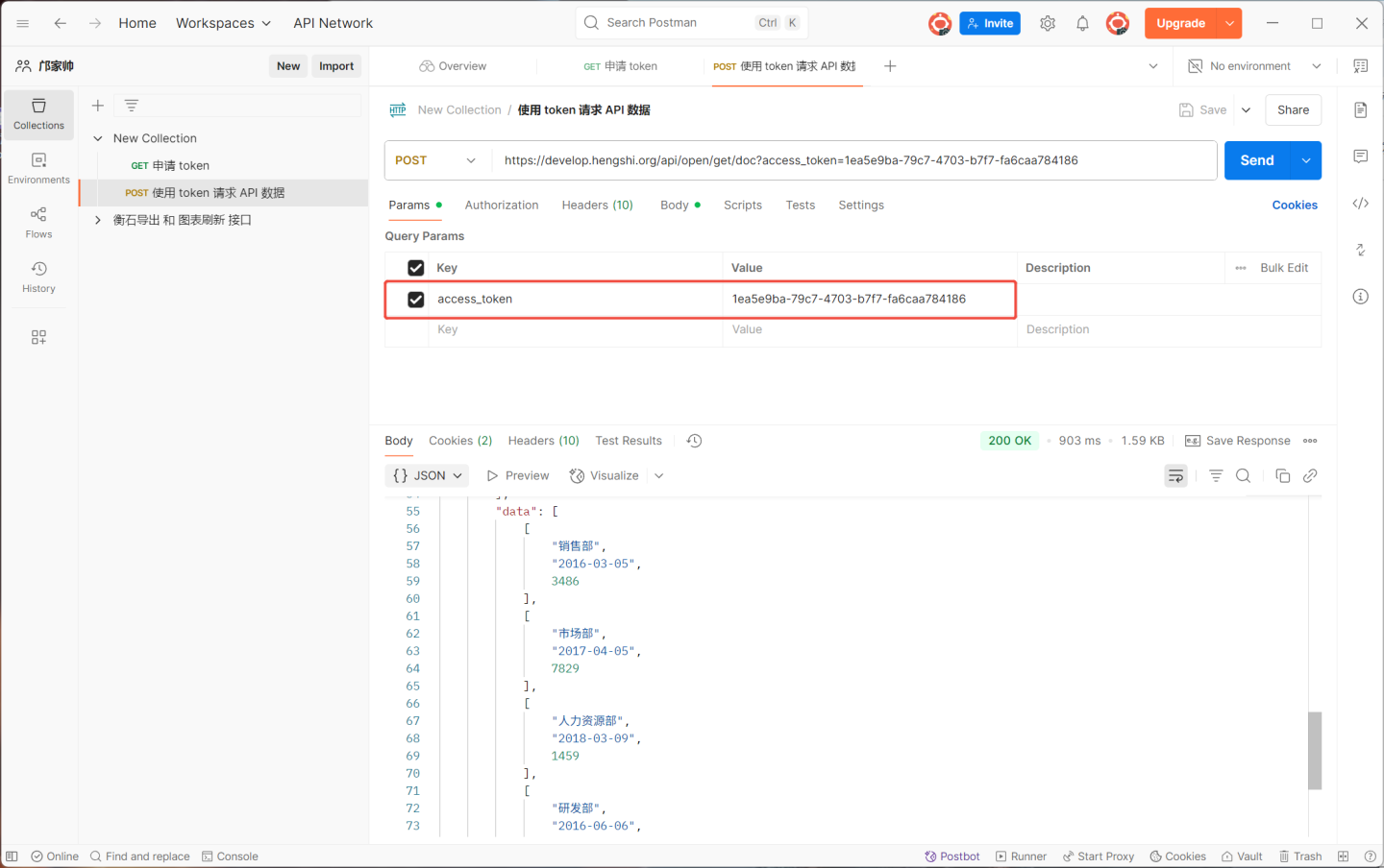 当 host 为https://develop.hengshi.org,path 为/api/open/get/doc,访问 API 的 url 为https://develop.hengshi.org/api/open/get/doc?access_token=1ea5e9ba-79c7-4703-b7f7-fa6caa784186 ,在 Apifox 上访问 API 获取数据如图所示。(说明:Apifox 将 url 中的参数进行了提取)
