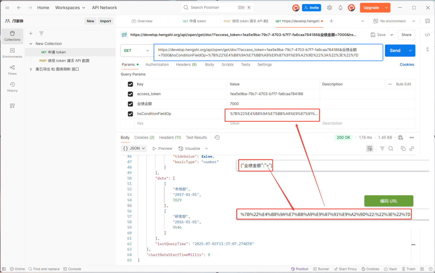 携带参数请求 API 时,url 格式为http://{host}/{path}?access_token={token}&{param}=....&hsConditionFieldOp={"{param}":"{op}"....}&hsConditionConnector=and/or,url 中需要体现参数值和运算符号。 在上述示例中,需要查看 业绩金额>7000的信息值,此时 url 为https://develop.hengshi.org/api/open/get/doc1?access_token=1ea5e9ba-79c7-4703-b7f7-fa6caa784186&业绩金额=7000&hsConditionFieldOp={"{业绩金额}":"{>}"},在访问 url 时还要对连接符 hsConditionFieldOp 的值进行 urlEncode 编码,所以最后使用的 url 为https://develop.hengshi.org/api/open/get/doc1?access_token=1ea5e9ba-79c7-4703-b7f7-fa6caa784186&业绩金额=7000&hsConditionFieldOp=%7B%22%E4%B8%9A%E7%BB%A9%E9%87%91%E9%A2%9D%22%3A%22%3E%22%7D