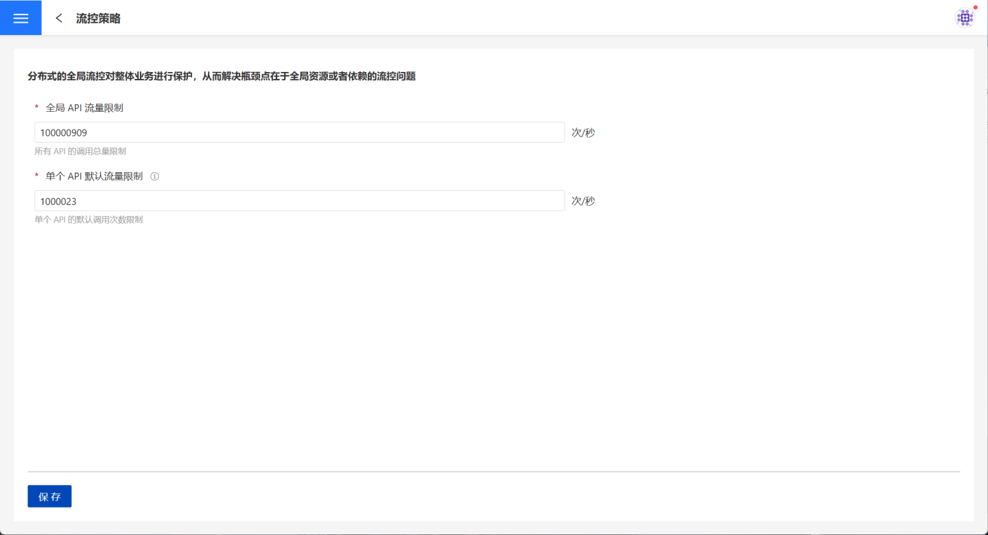全局 API 流量限制指对系统中所有 API 流量总和进行控制,流量总和不能超过全局 API 流量的设置。超出部分的 API 将拒绝访问。