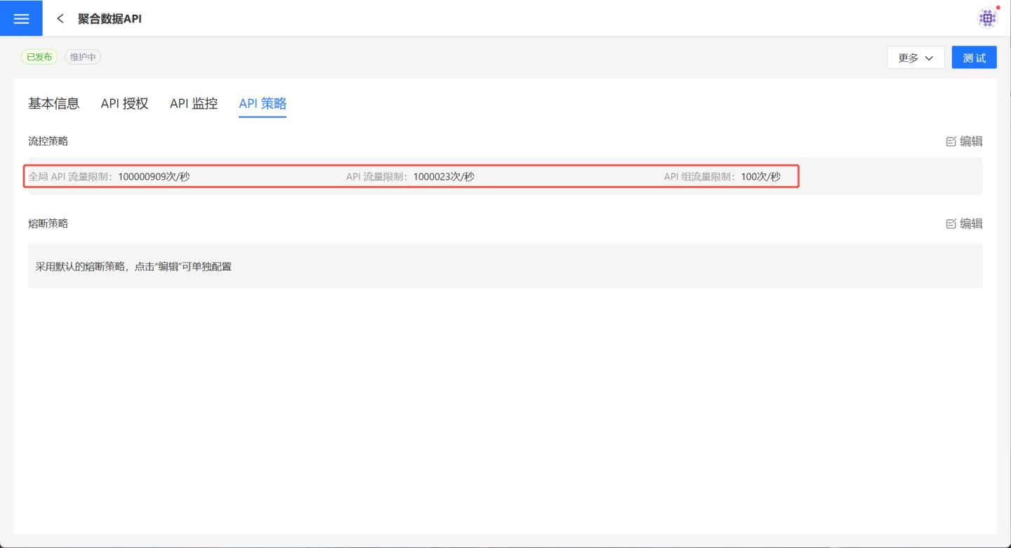 单一 API 熔断设置是指对某个具体的 API 进行熔断规则设置,规则设置后该 API 不受全局 API 熔断规则限制。具体设置请参考API 熔断。