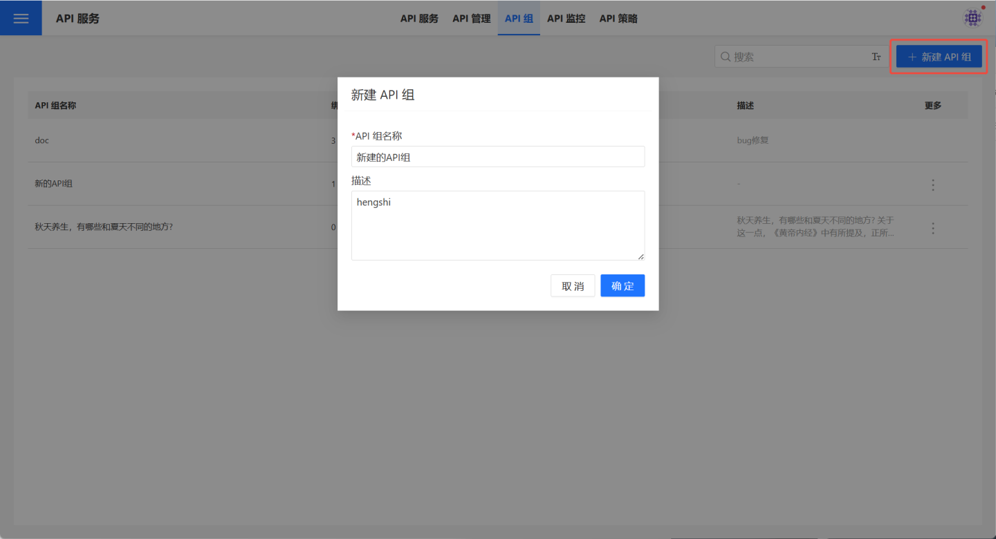 拥有 API 管理角色的用户都可以创建 API 组,点击API 服务->API 组->+ 新建 API 组,打开新建弹窗。输入 API 组名称和描述,API 组即创建完成。