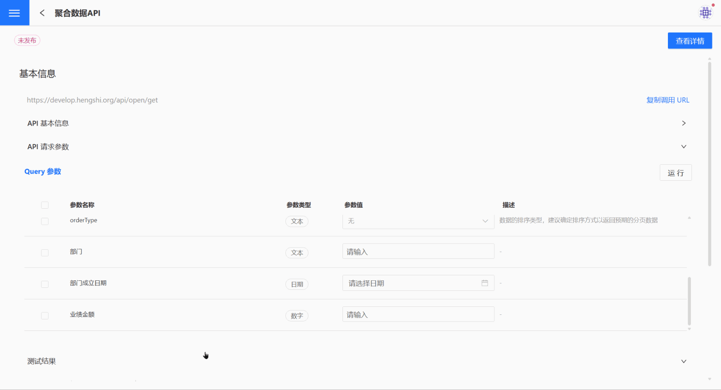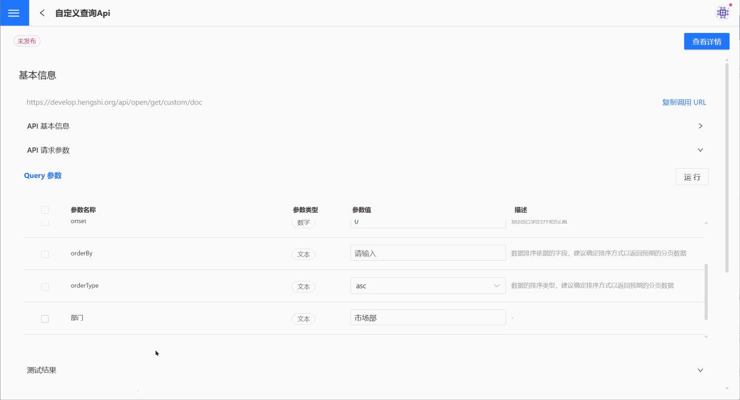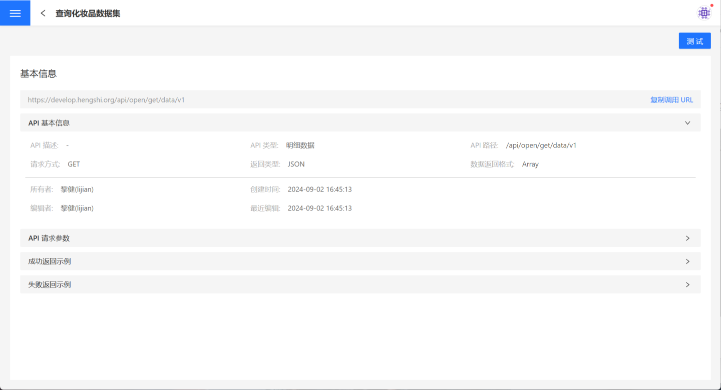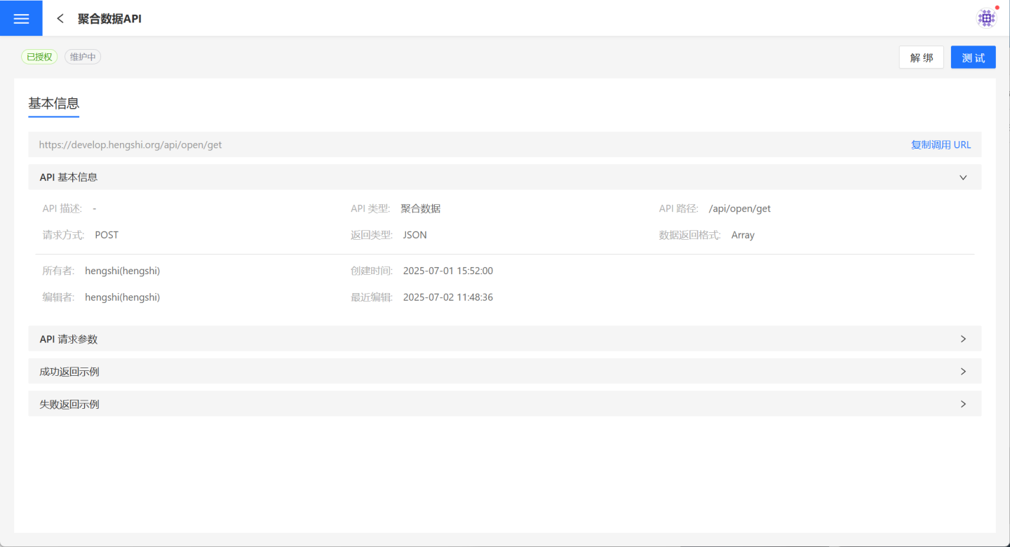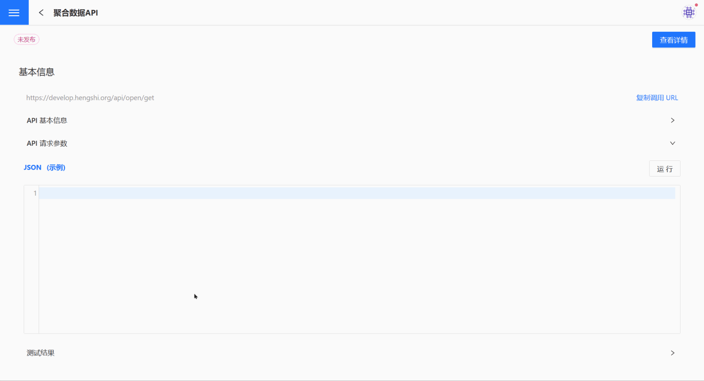 在 API 服务页面可以通过点击某 API 查看其详情信息,在详情页面了解 API 的基本信息、调用 URL 以及请求参数,还可以对 API 进行测试,查看 API 的功能效果。