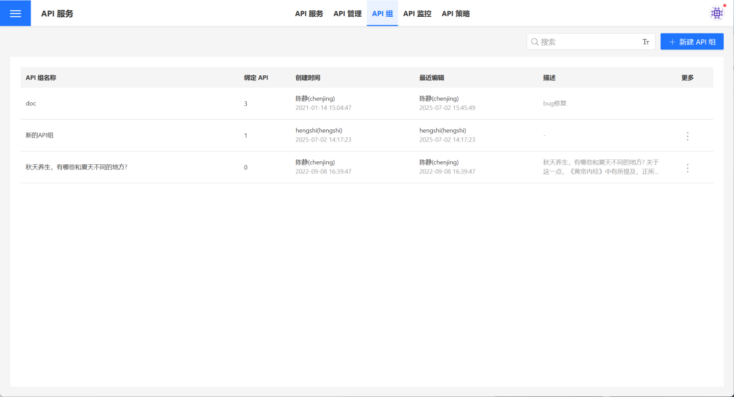 点击API 服务->API 组,打开 API 组列表,展示当前用户有访问权限的所有 API 组,包括自己创建的和被授权的。