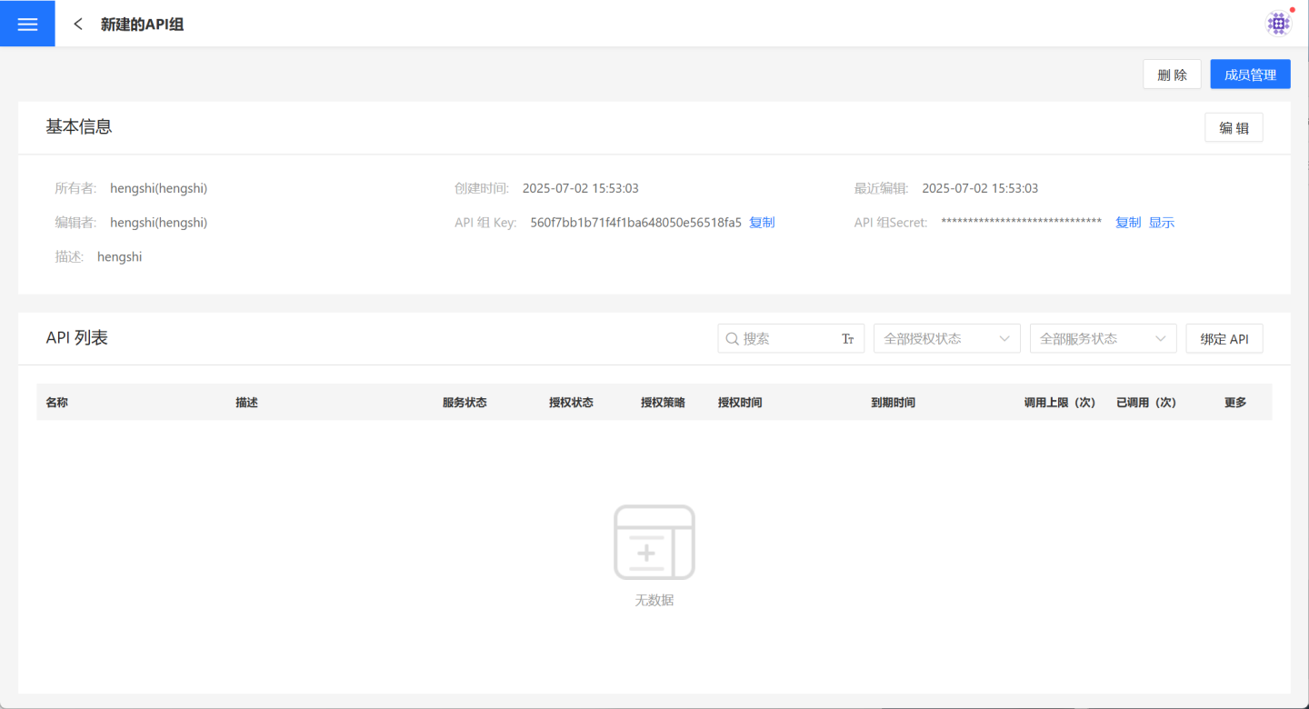 API 组创建完成,页面即刷新展示其详情页面,有权限的用户也可以点击API 服务->API 组,选择某个 API 组打开其详情页面。