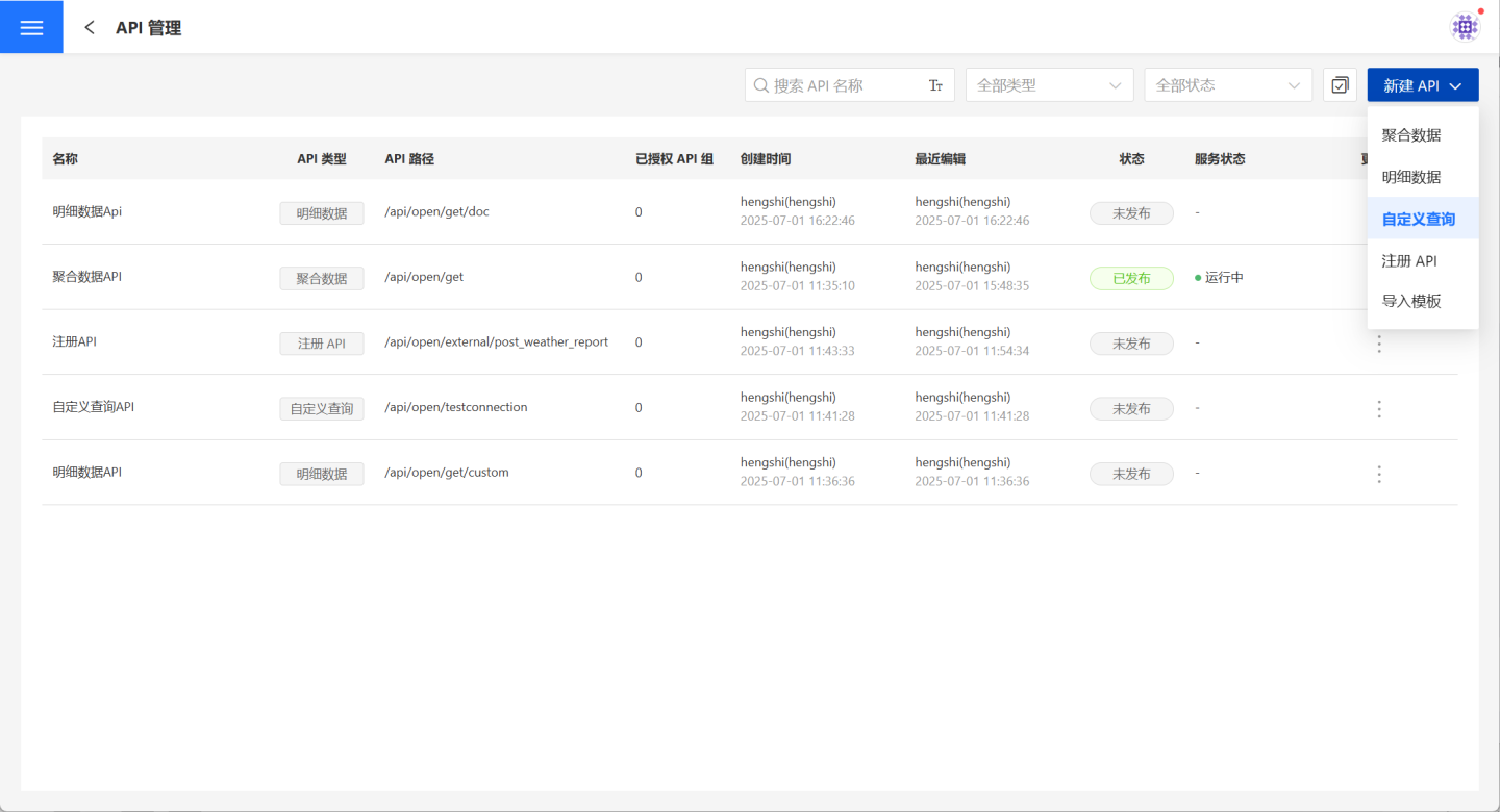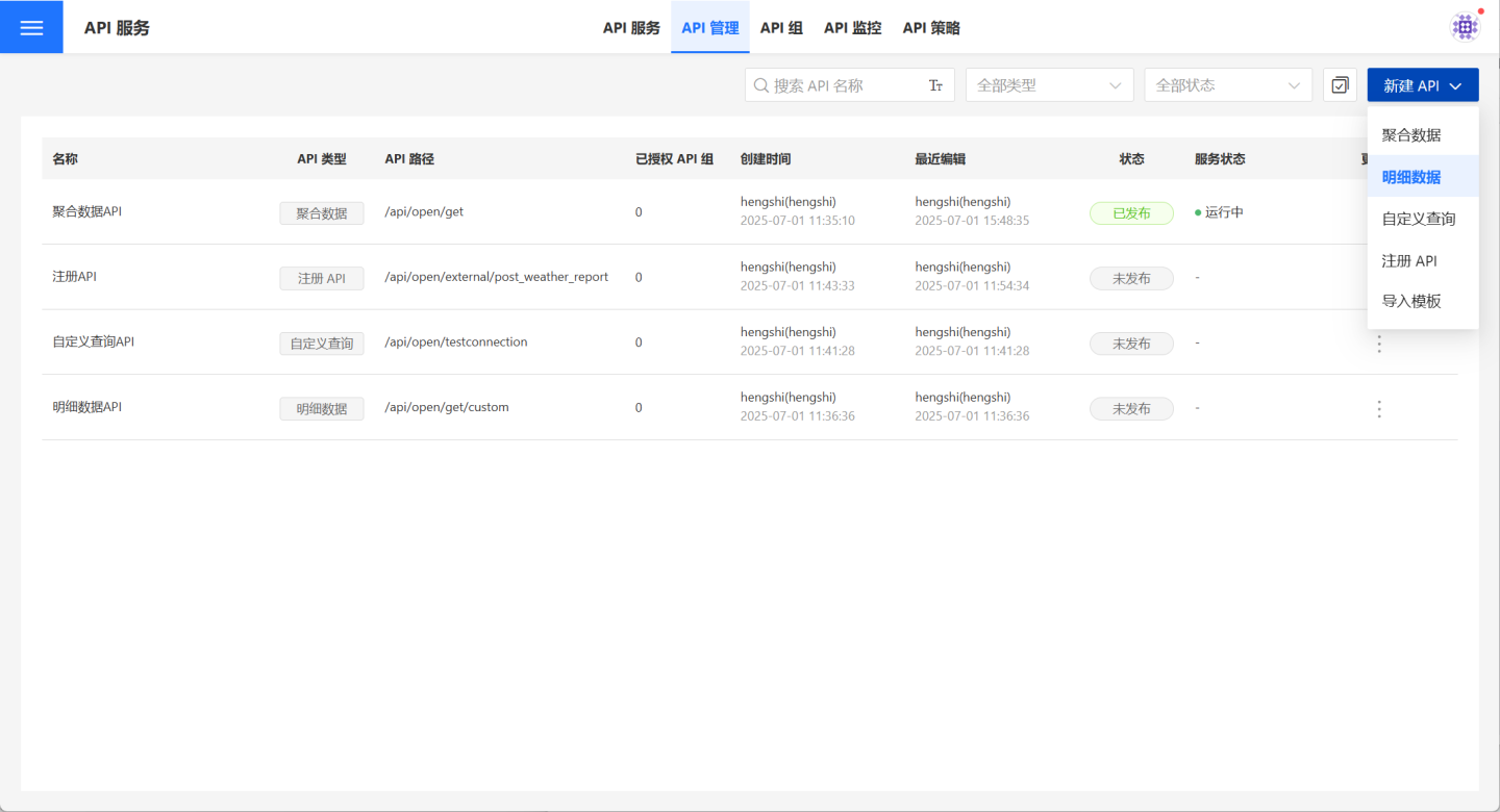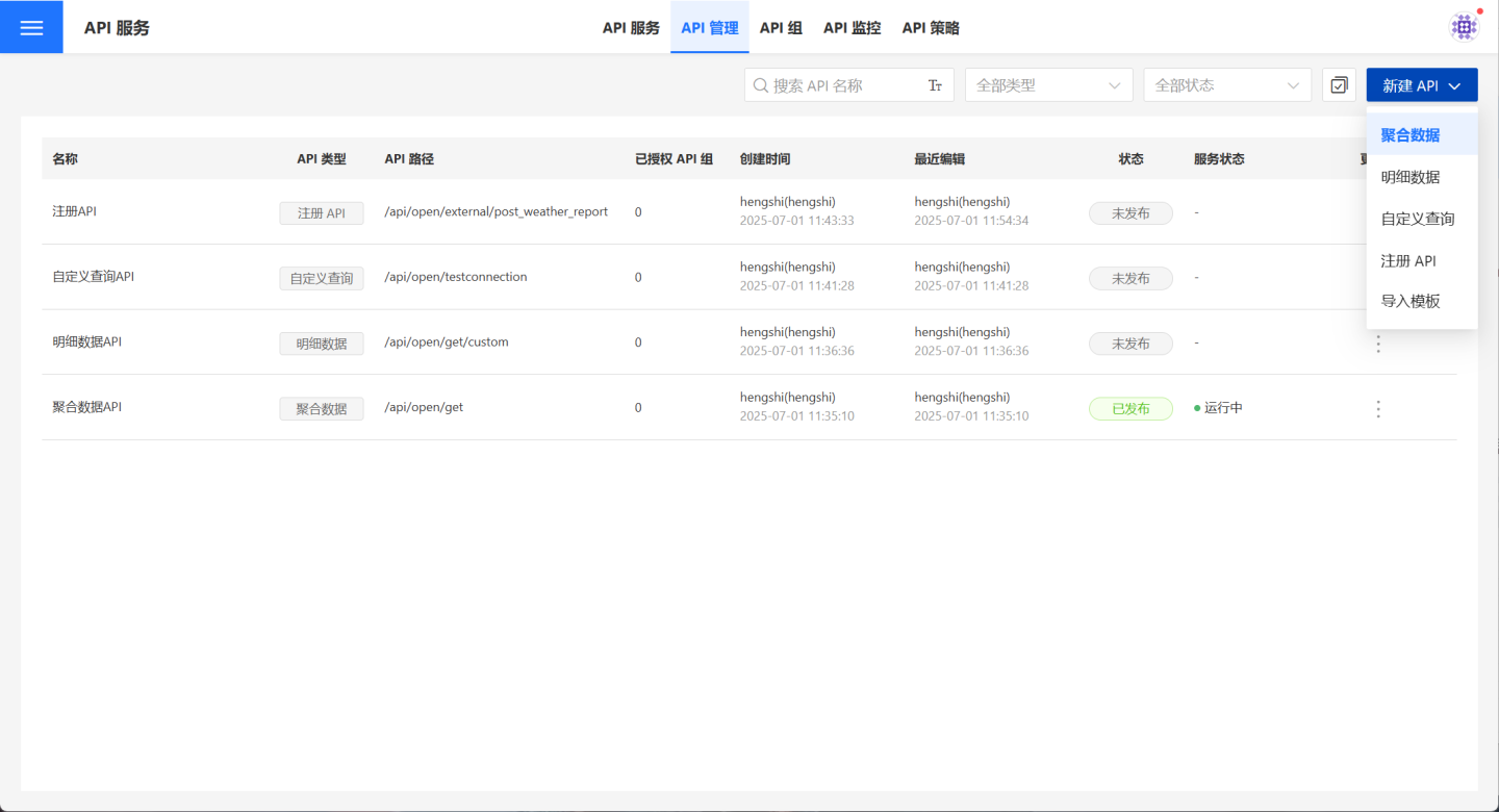 API 管理页面中用户可以管理自己的 API,支持用户创建或导入聚合数据 API、明细数据 API、自定义查询 API 和注册 API 四种 API。支持对创建的 API 进行发布、授权、限流、监控等相关操作。