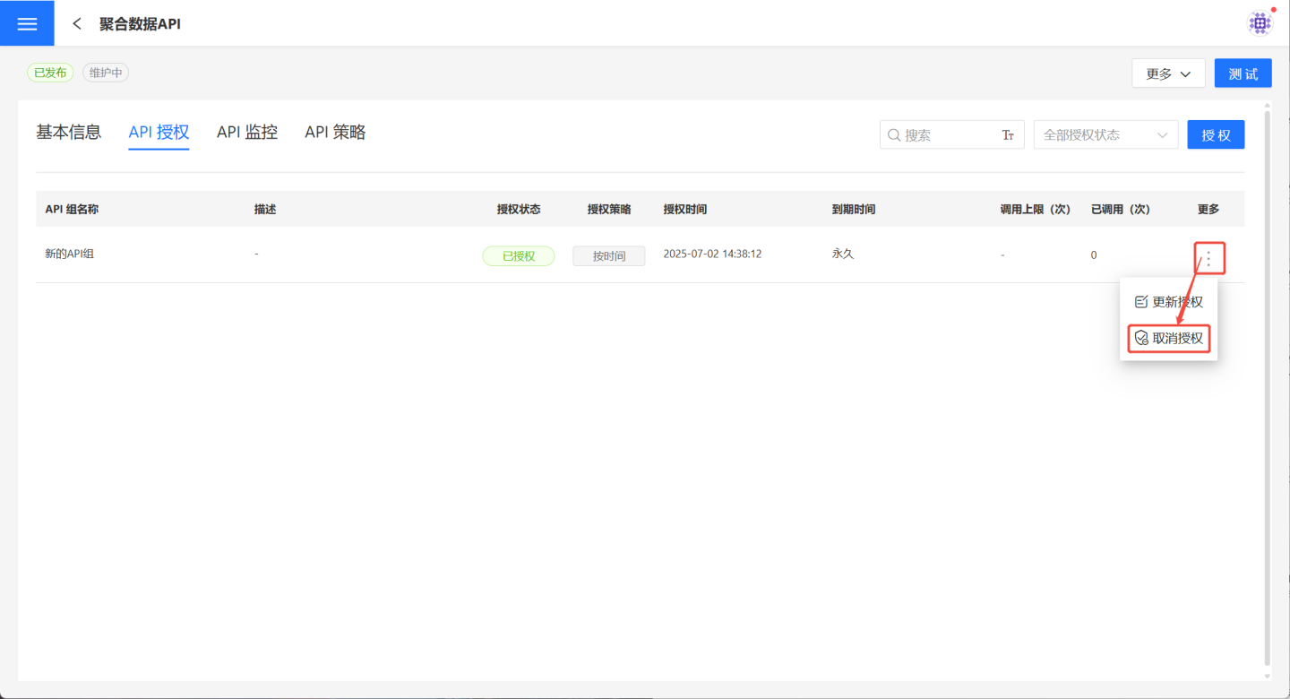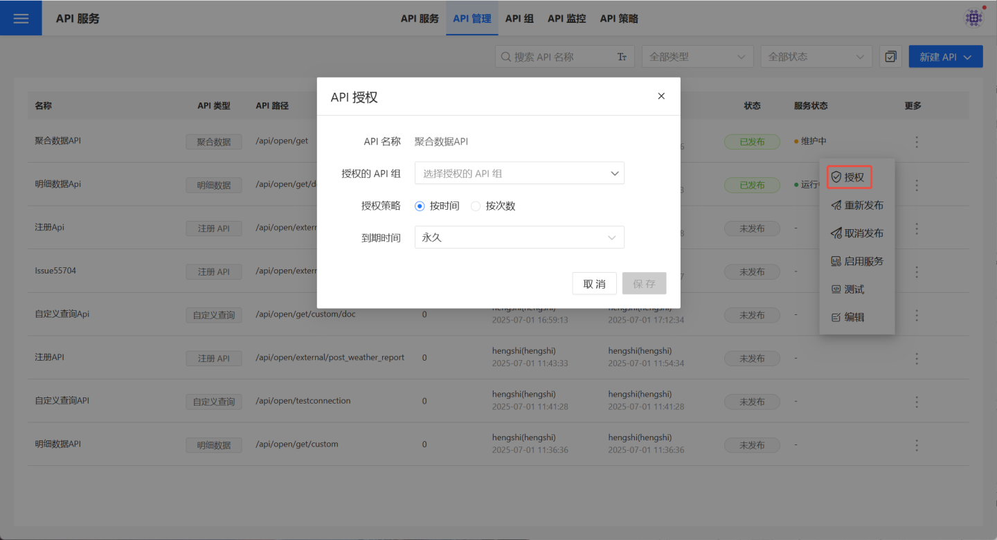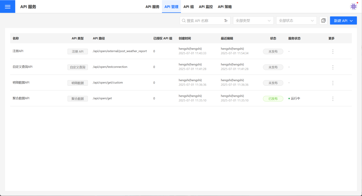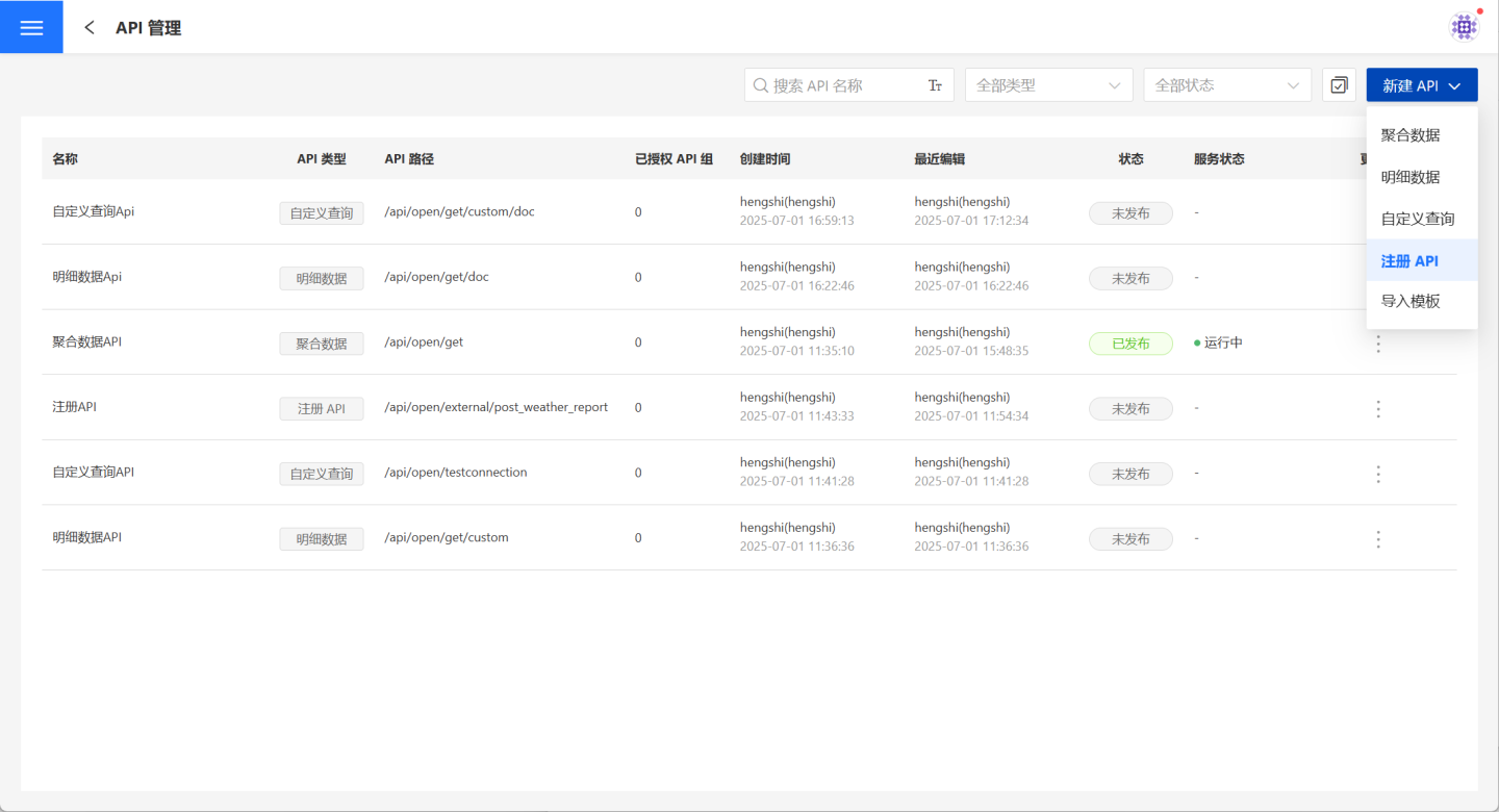 API 管理页面中用户可以管理自己的 API,支持用户创建或导入聚合数据 API、明细数据 API、自定义查询 API 和注册 API 四种 API。支持对创建的 API 进行发布、授权、限流、监控等相关操作。