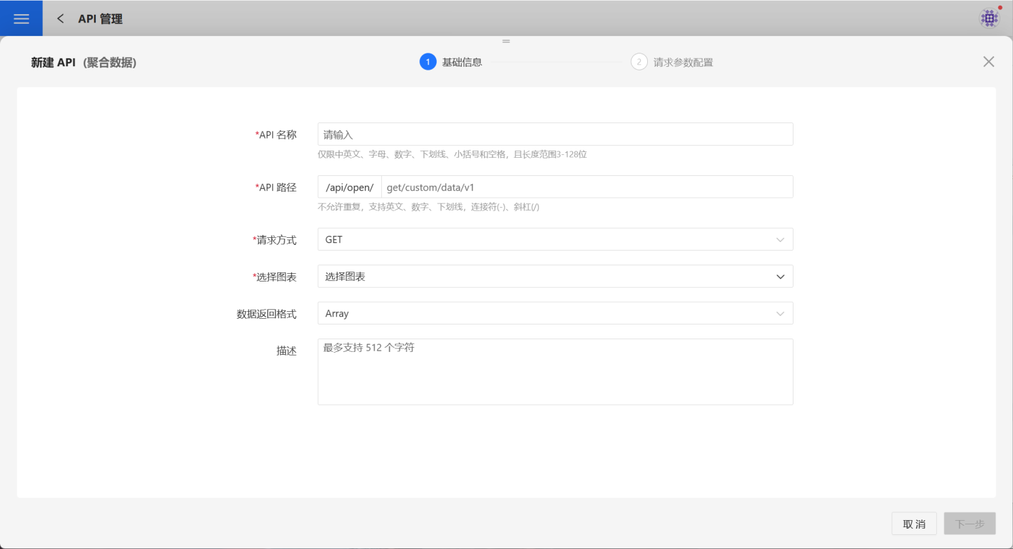 2.填写基本信息。 在页面中按照要求填写 API 名称、API 路径、请求方式、选择图表等基本信息,基本信息的详细要求参见如下表格。