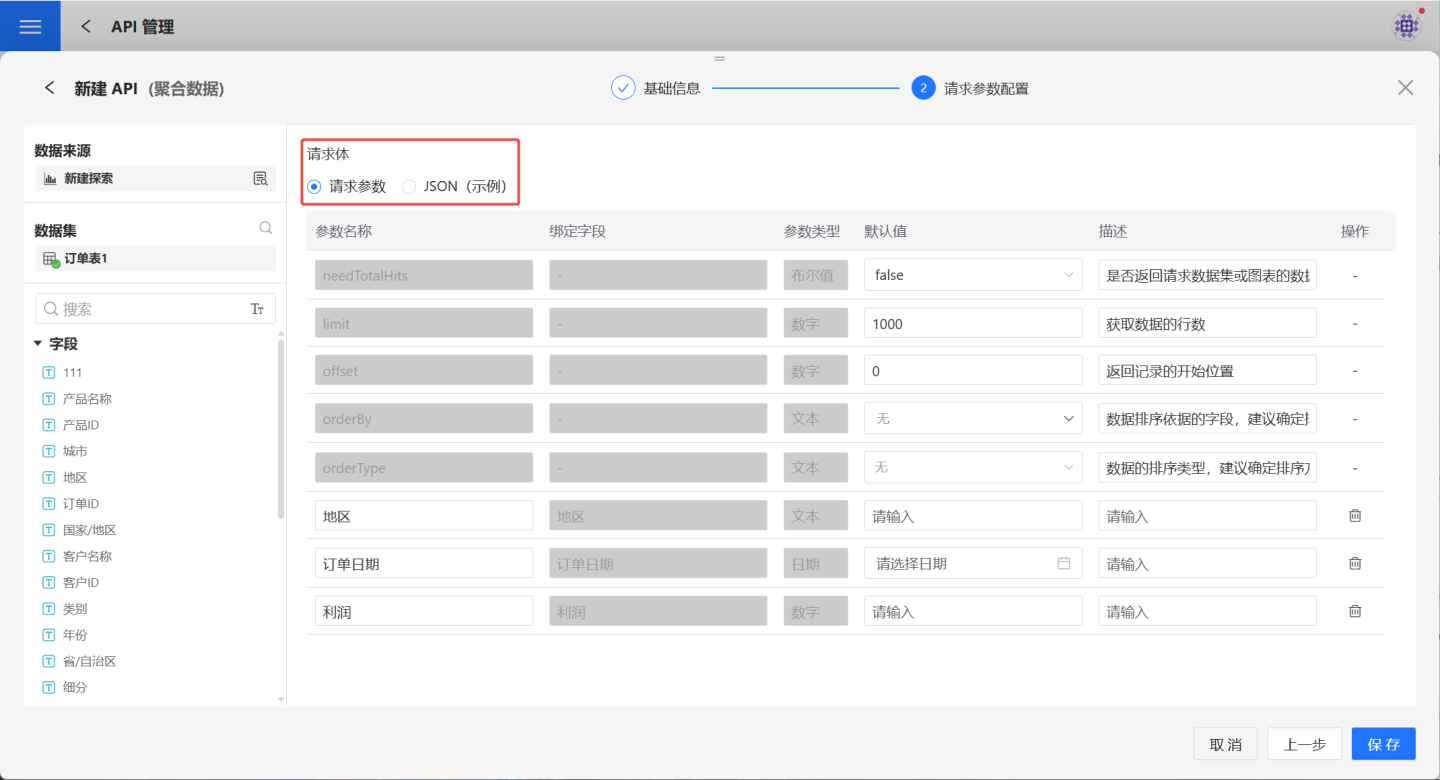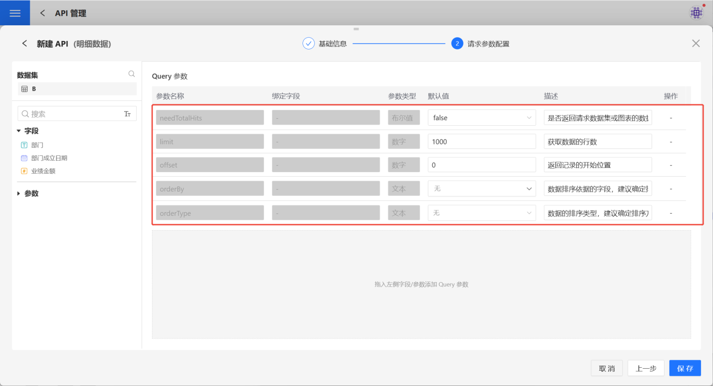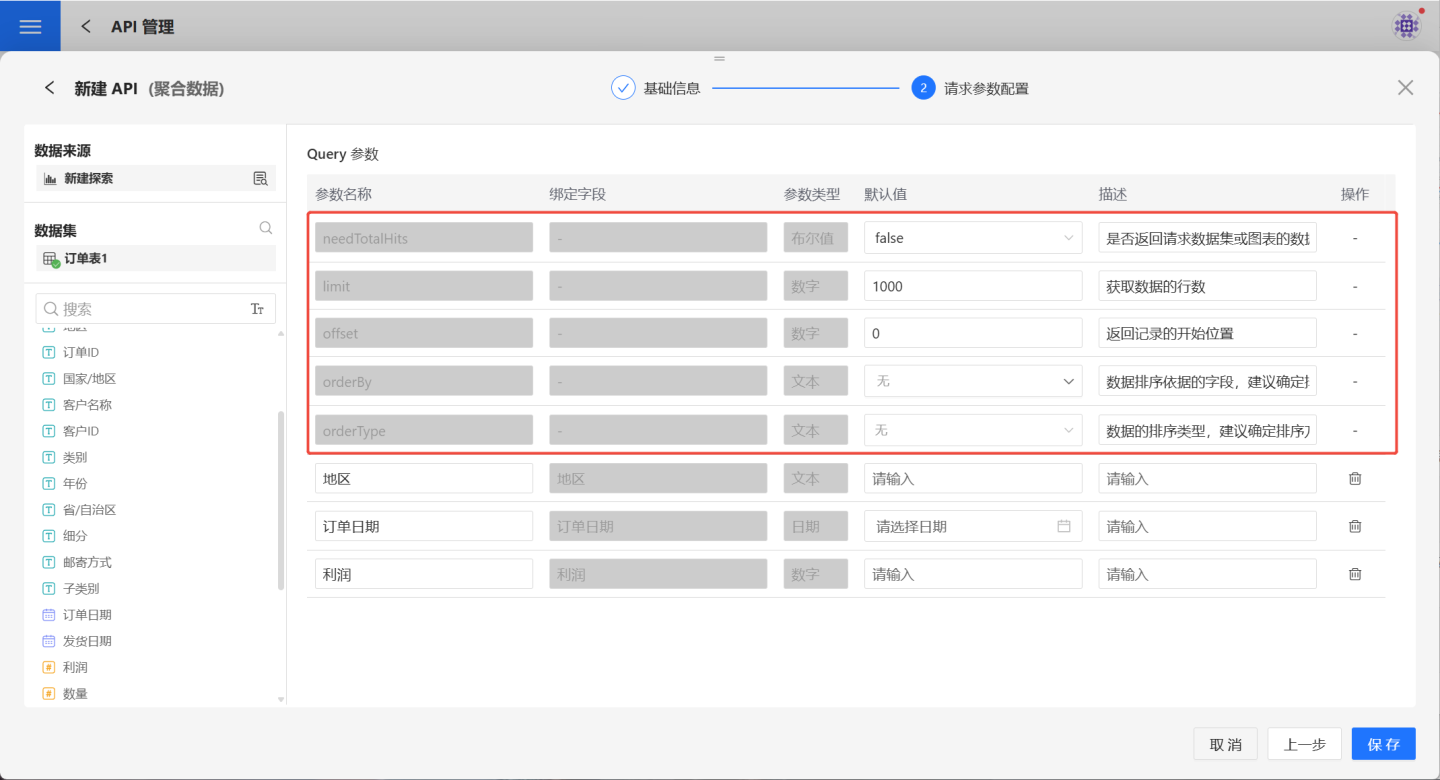 | 默认请求参数 | 是系统自带的请求参数,不能修改和删除。needTotalHits 表示是否返回请求数据的总行数。默认为 false,不返回请求数据的总行数。limit 指获取记录的总数,默认值1000,即表示获取1000条记录。offset 指返回记录的开始位置,默认值为0,表示从第1条记录开始获取,一共获取 limit 条。orderBy 数据排序依据的字段,建议进行设置。orderType 指 orderBy 的排序方式,支持升序、降序、无排序三种方式。 |