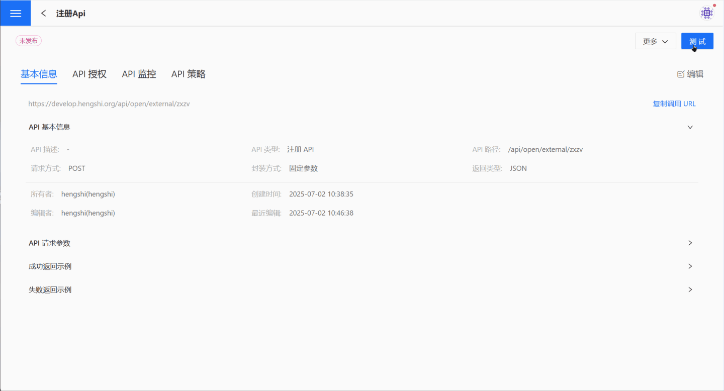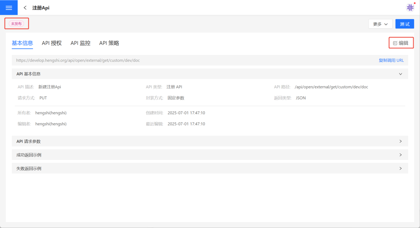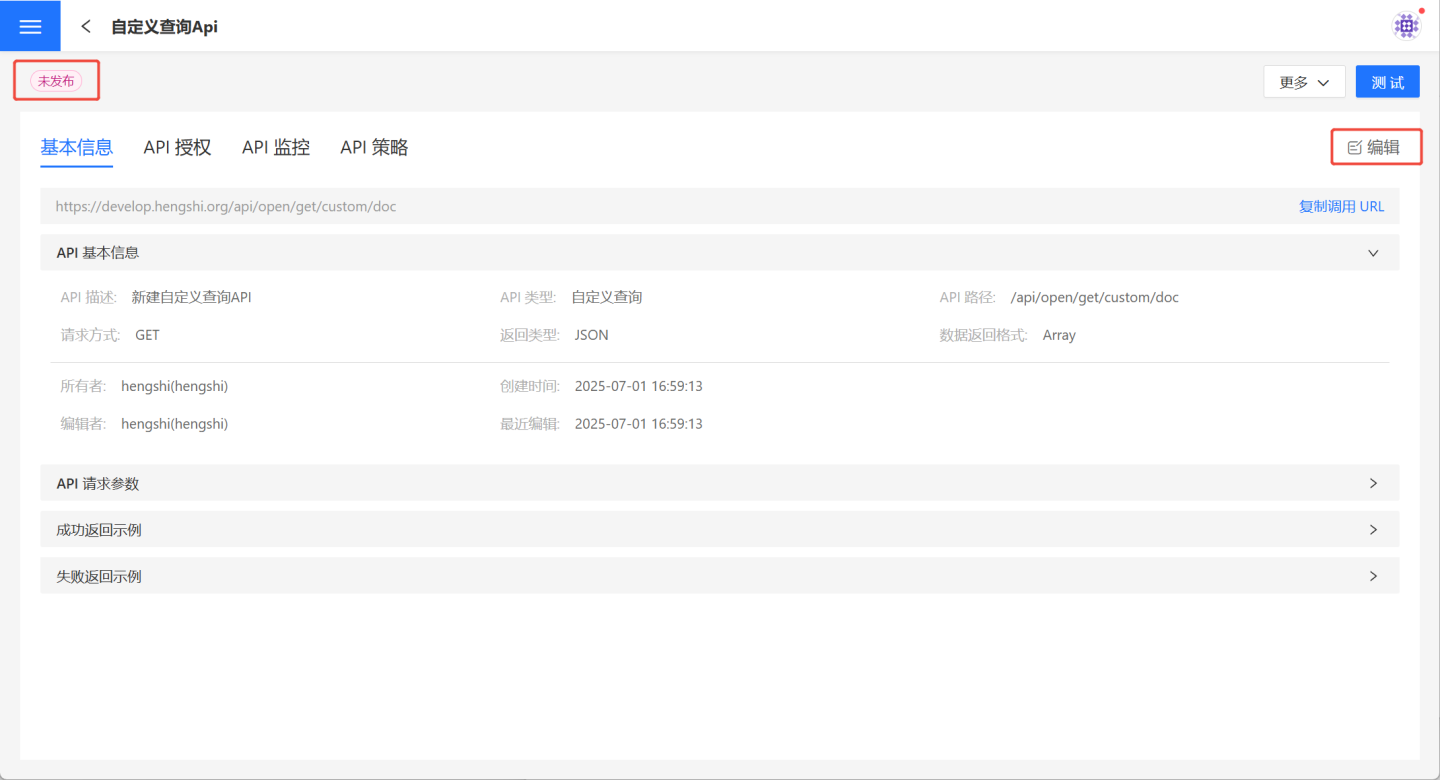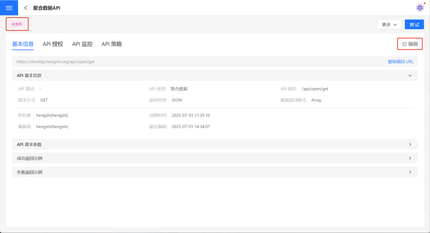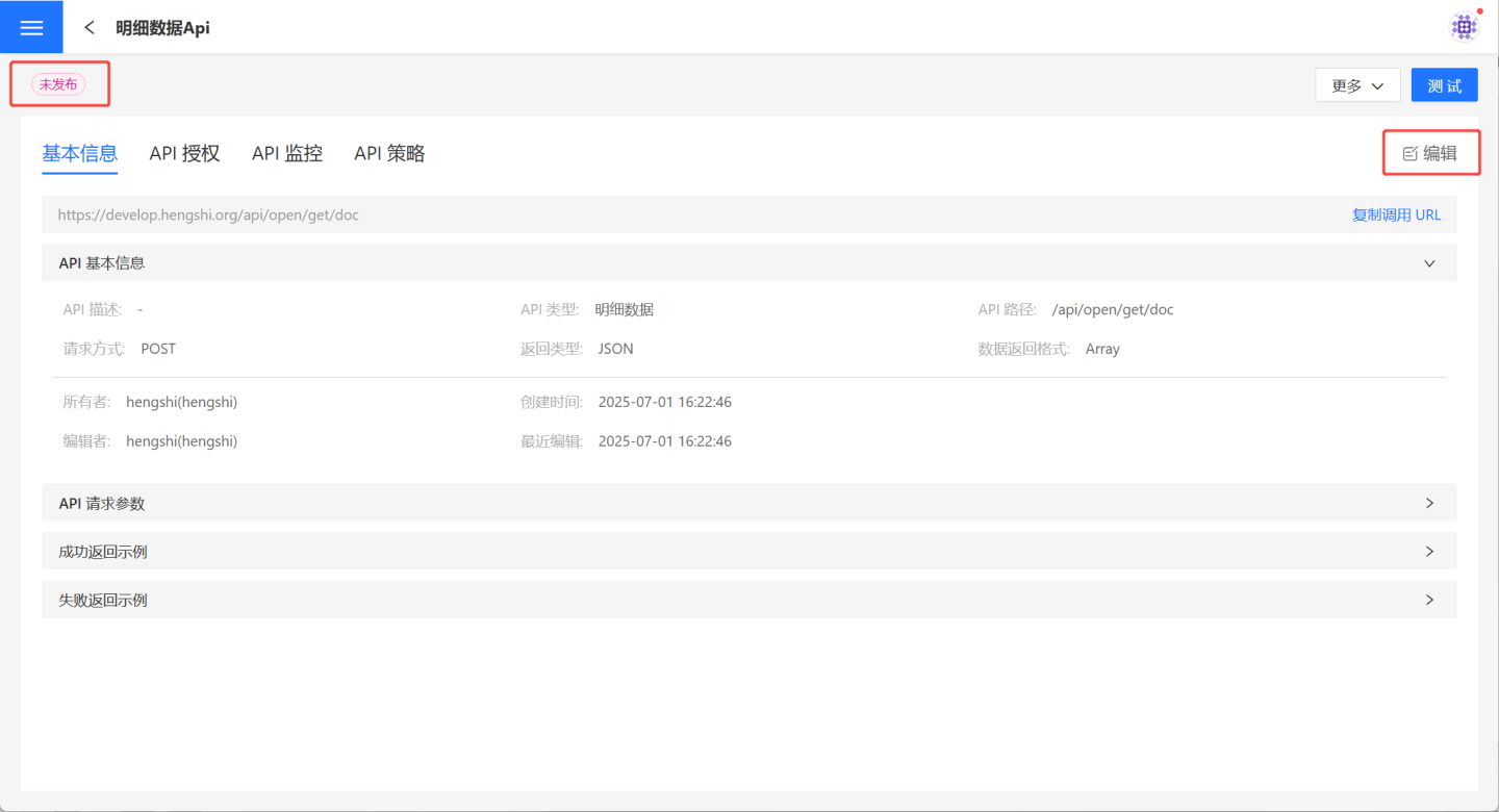 参数配置保存后,API 创建成功,状态为未发布。用户可以在 API 详情页核对 API 信息,如有问题可以点击右侧的编辑进行修改。
