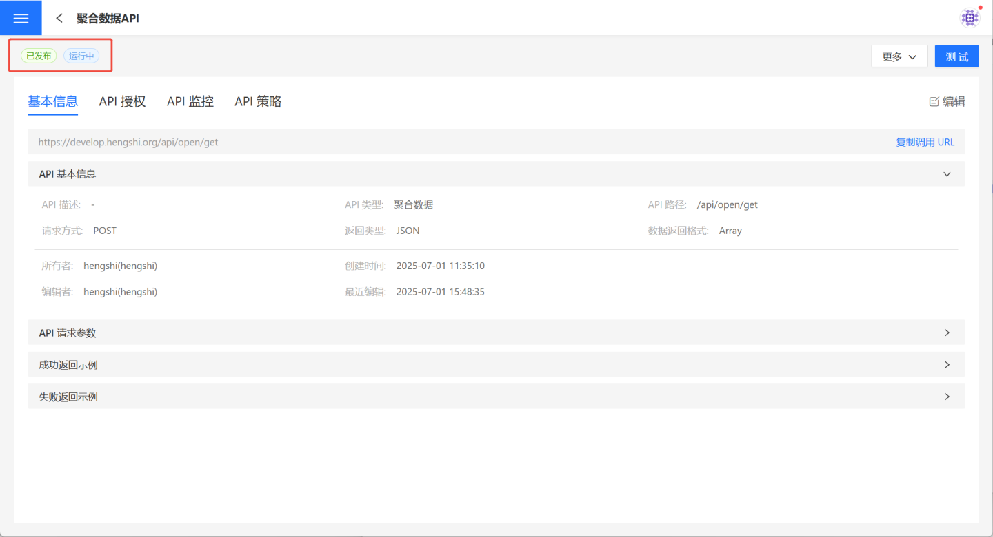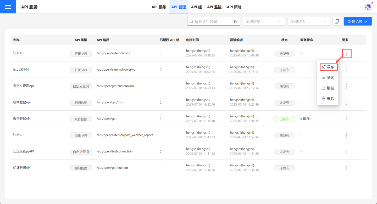 API 完成充分测试后会进行发布。发布后 API 状态变更为已发布、运行中,并且在API 服务中展示供调用者使用。