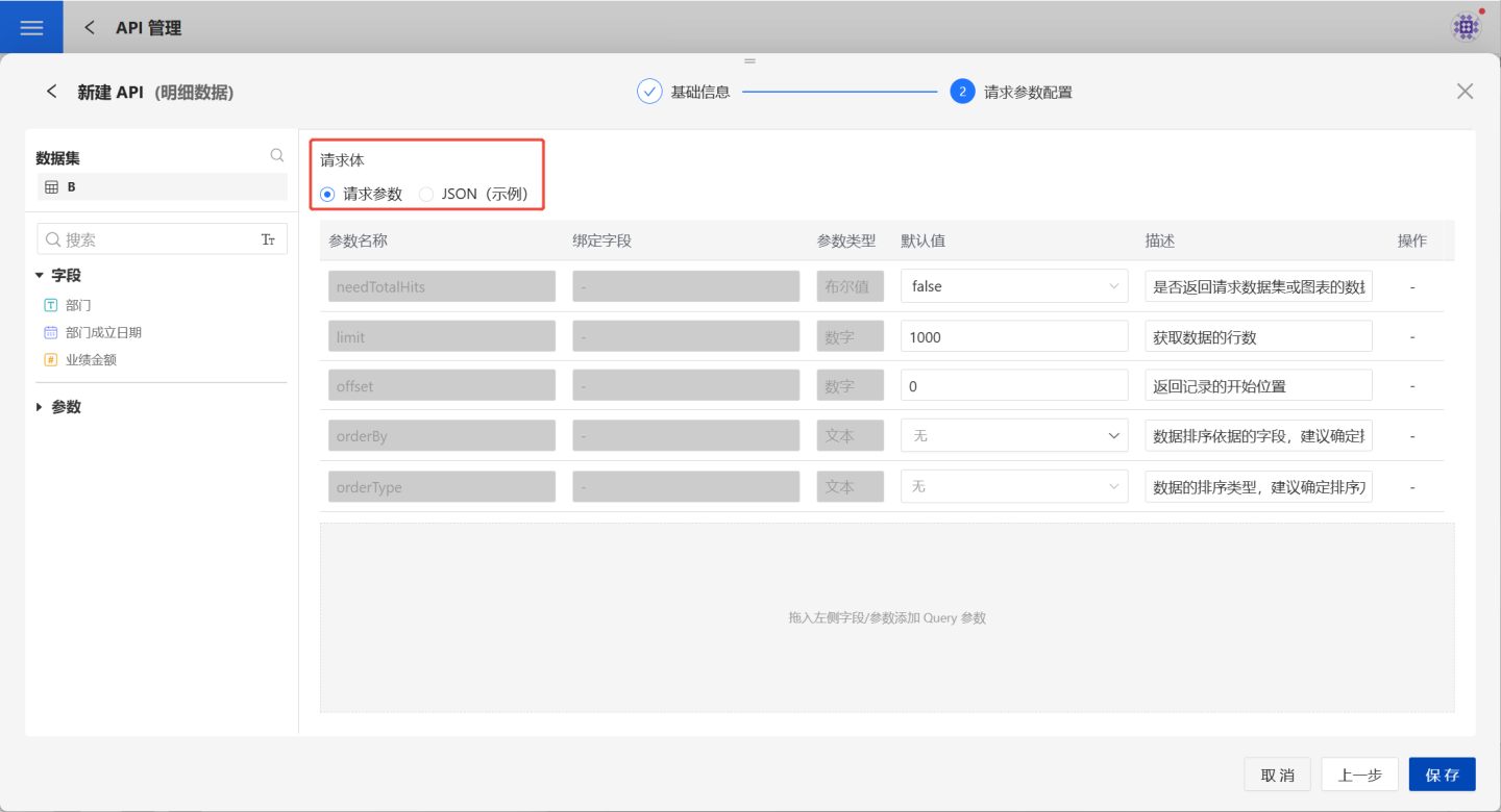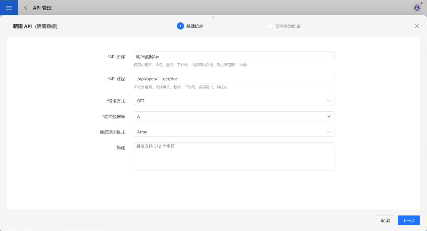 1.新建 API。 在 API 管理页面,点击新建 API,选择明细数据,弹出新建 API(明细数据)页面。