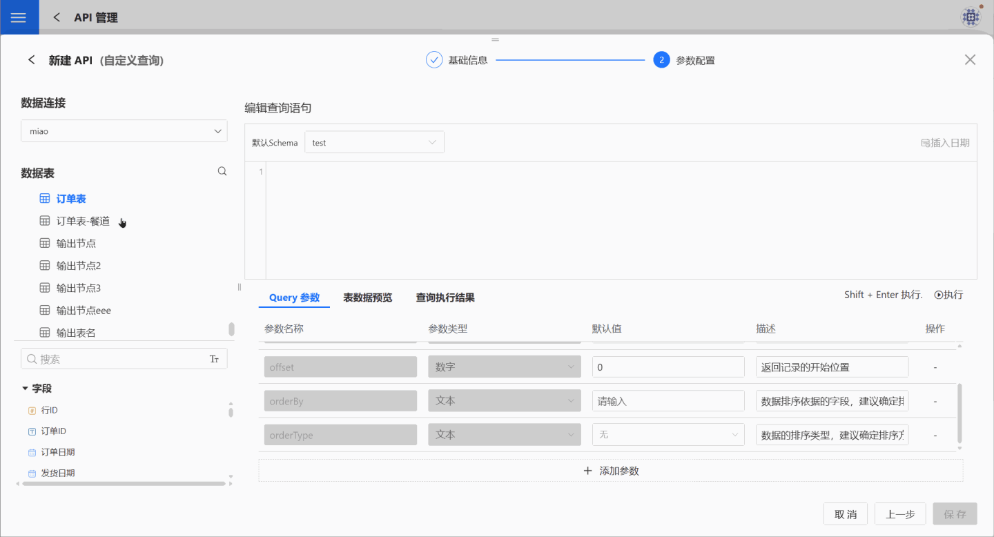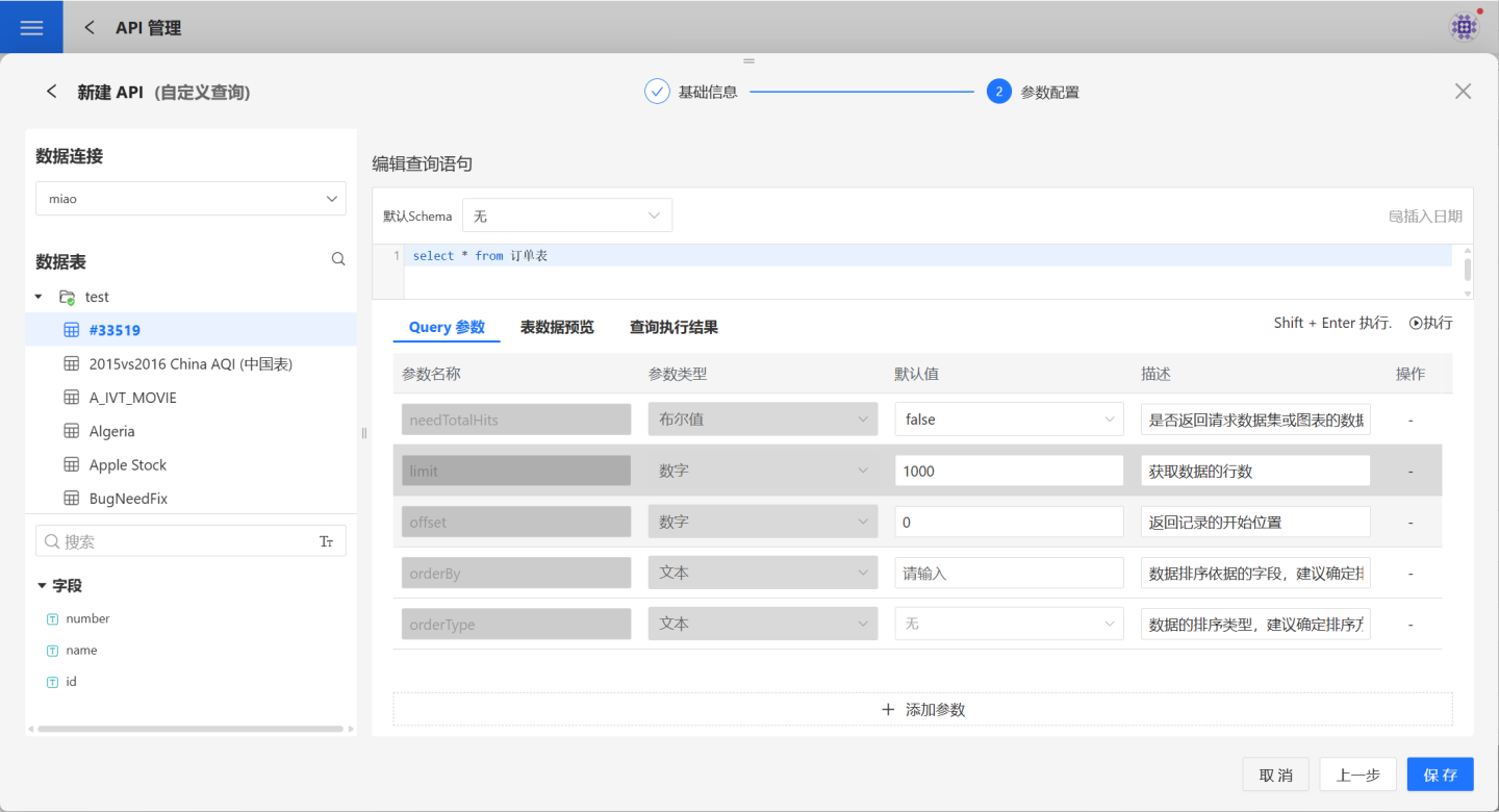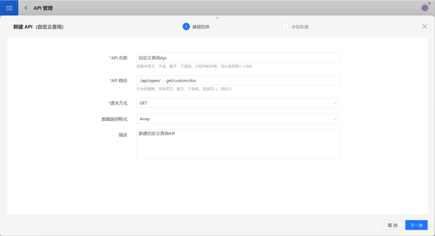 1.新建 API。 在 API 管理页面,点击新建 API,选择自定义查询,进入新建 API (自定义查询)页面。