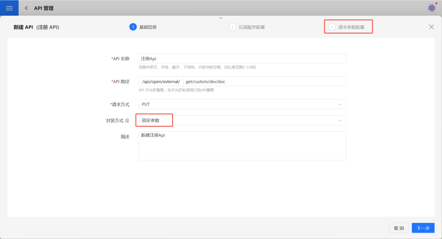 填写基本信息。 在基本信息页面按要求填写 API 名称、API 路径、请求方式及封装方式,增加 API 描述信息。