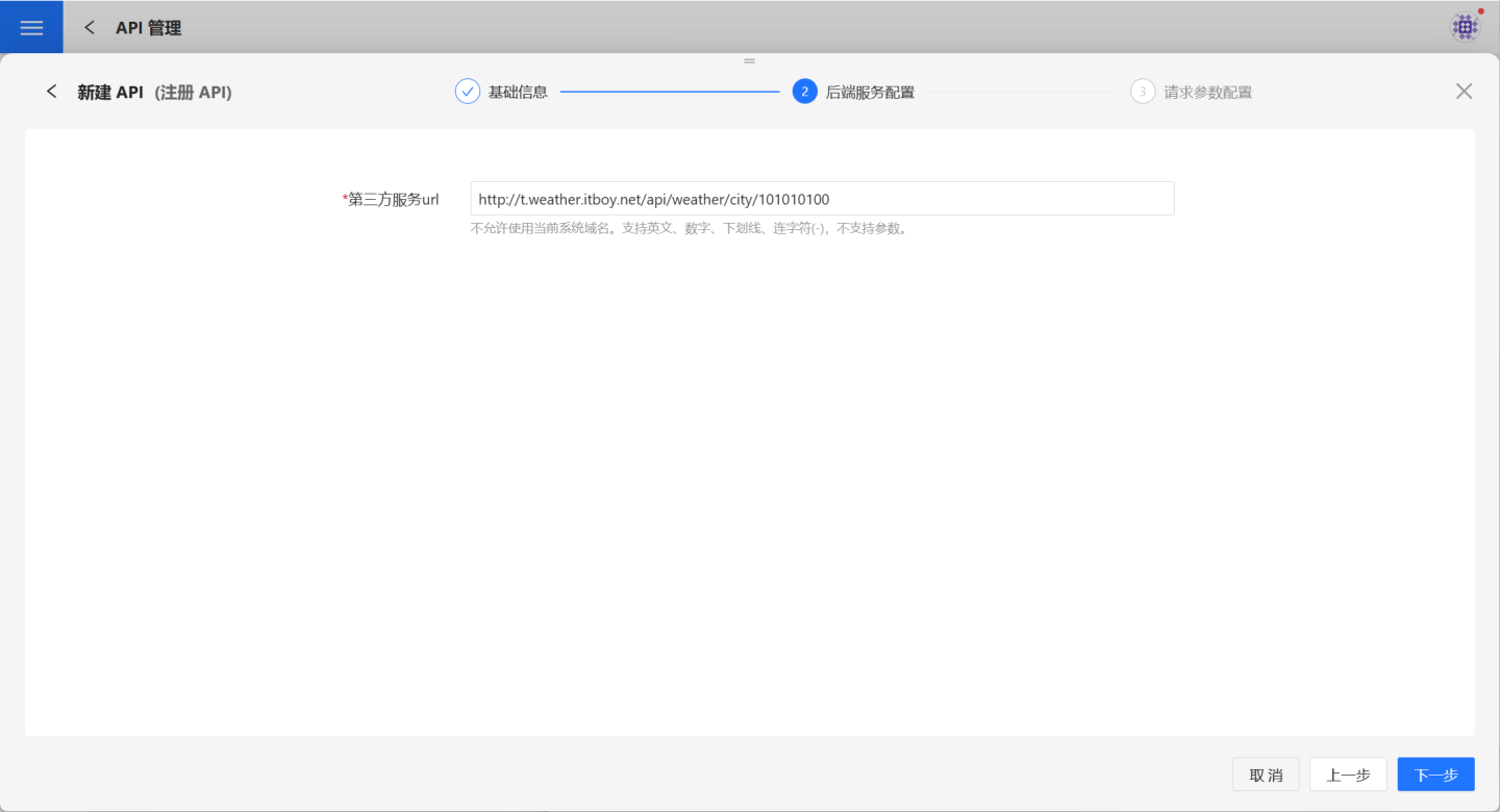 | API 名称 | 填写 API 名称。 名称仅限中英文、字母、数字和下划线,且长度范围3-128位。 系统内当前用户的 API 不可重复。 发布后则须系统内所有用户的 API 不可重复。 |