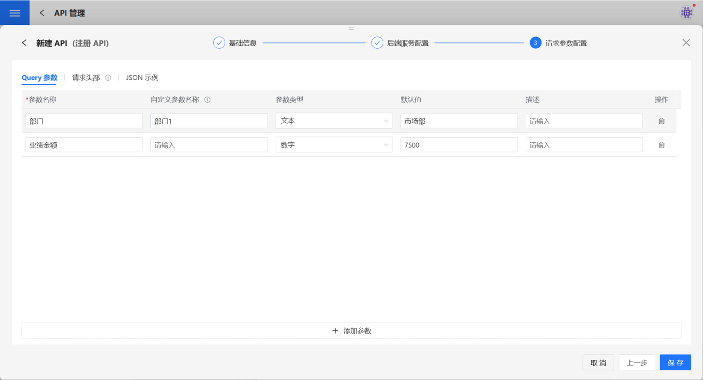 | 请求参数 | 自定义查询时的请求参数,用户须定义参数名称、类型、默认值、描述。 请求参数须与查询语句中的参数匹配。 |