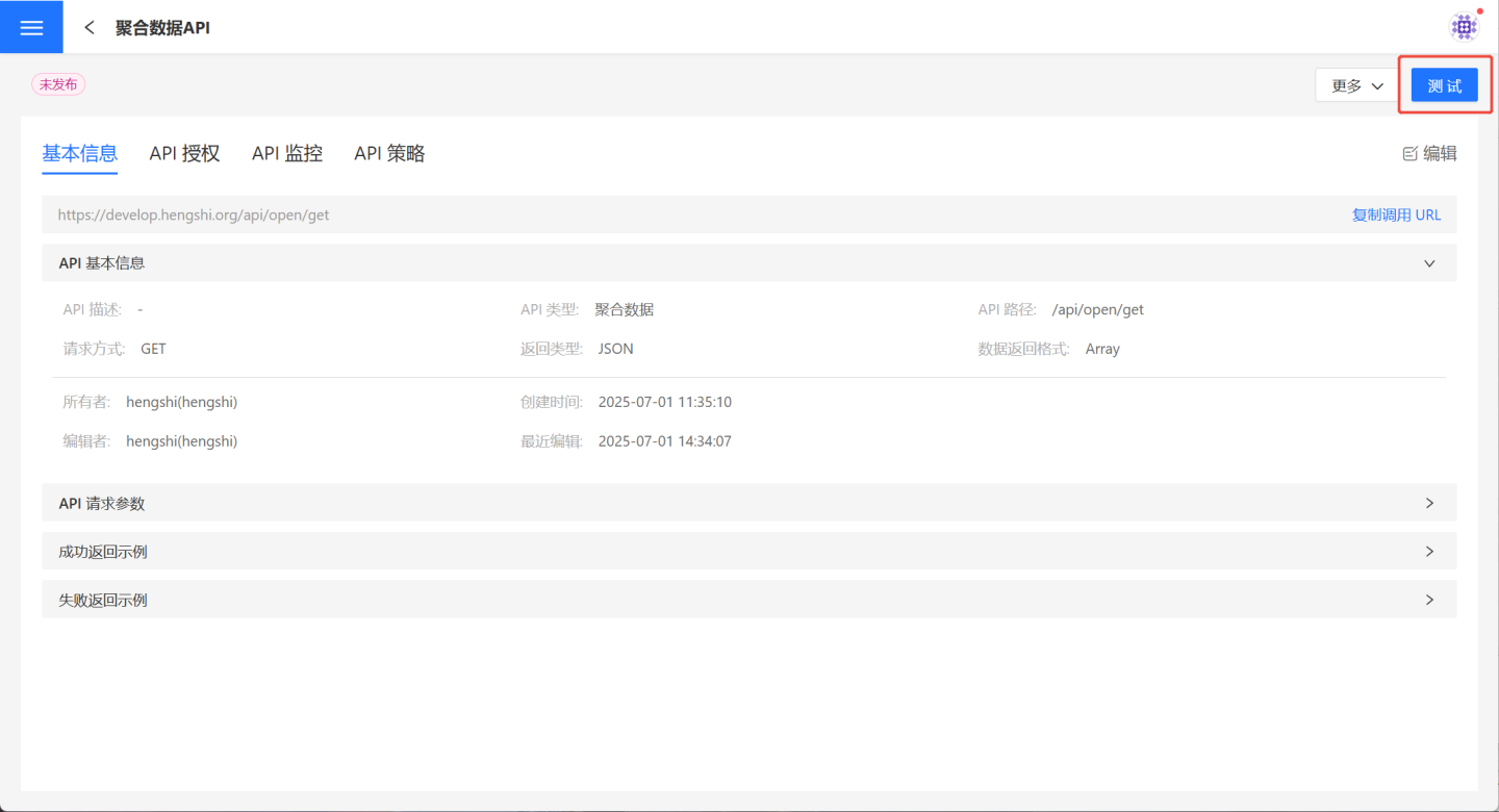 聚合数据 API 创建后需要进行测试,检查 API 功能是否满足要求。进入 API 的详情页,点击右侧上方的测试按钮,进入测试页面。