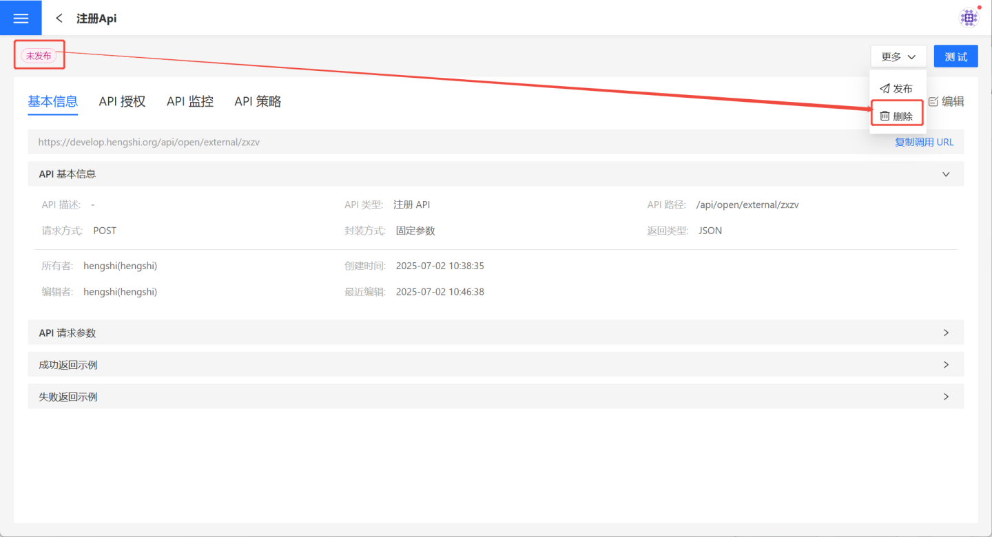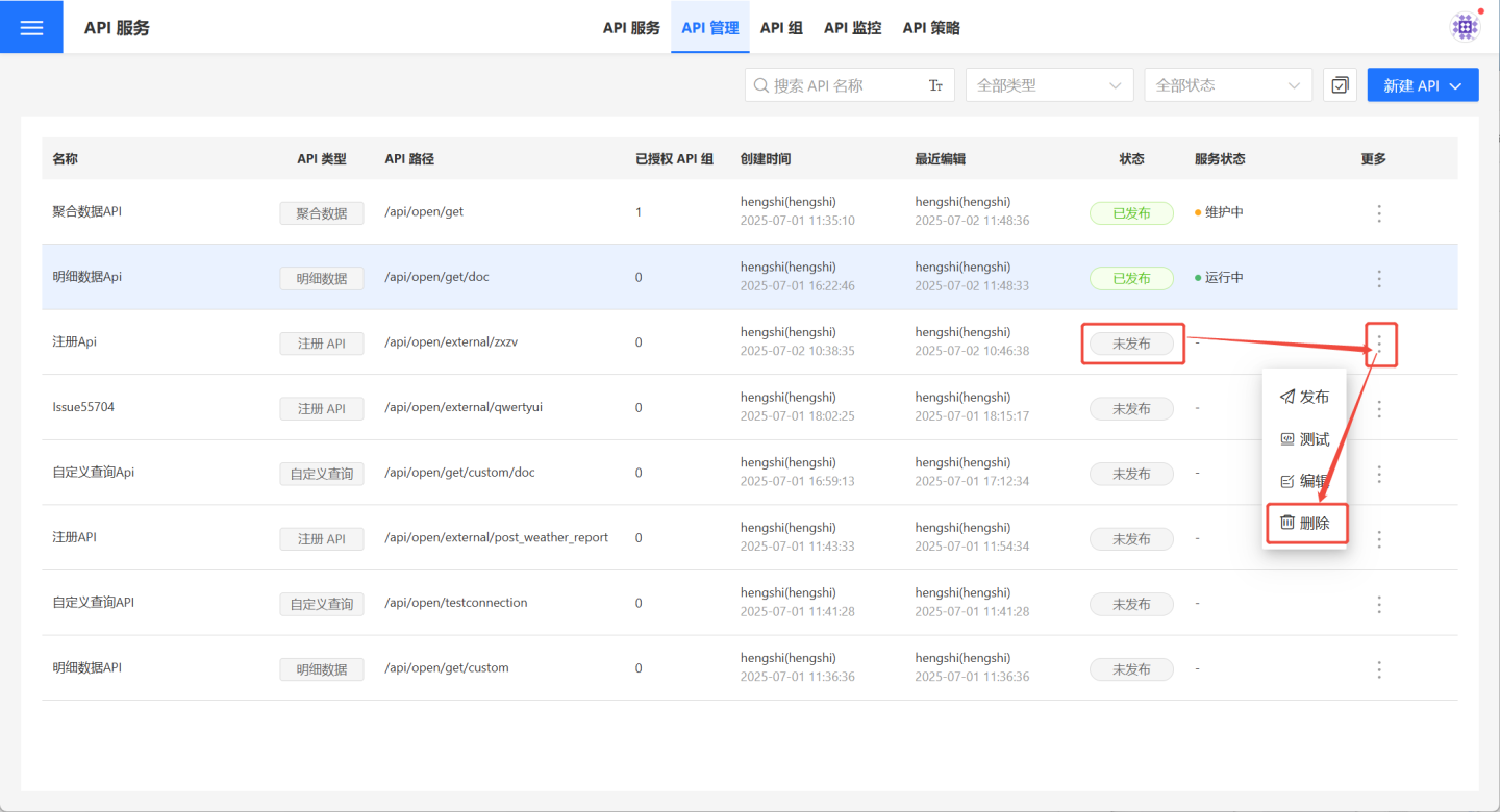 …菜单->取消发布,方可操作删除。 - 未发布状态的 API 可正常删除。