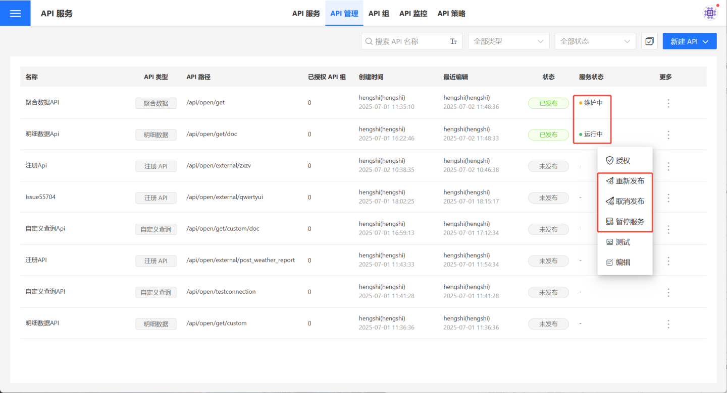 在发布态的 API,支持根据数据更新情况启动/暂停 API 操作,保证 API 获取最新数据。启动 API 服务时,相应 API 服务状态为运行中,暂停服务时,API 服务状态为维护中。