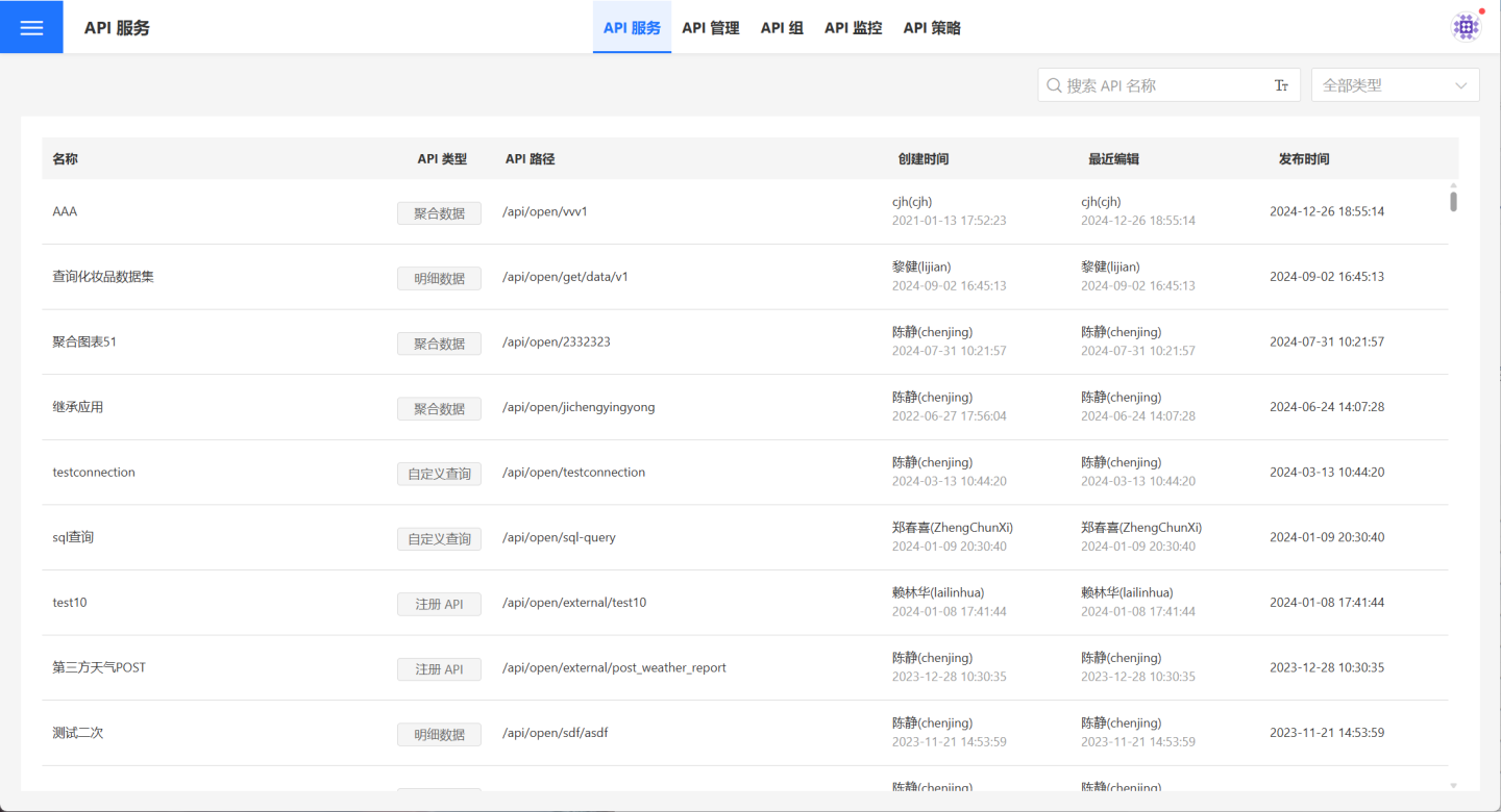 API 服务页面的功能是展示系统中的 API。在这里用户可以看到系统中可提供服务(处于发布态)的 API 列表,可以通过页面右上角的搜索和类型过滤快速定位到查找的 API。