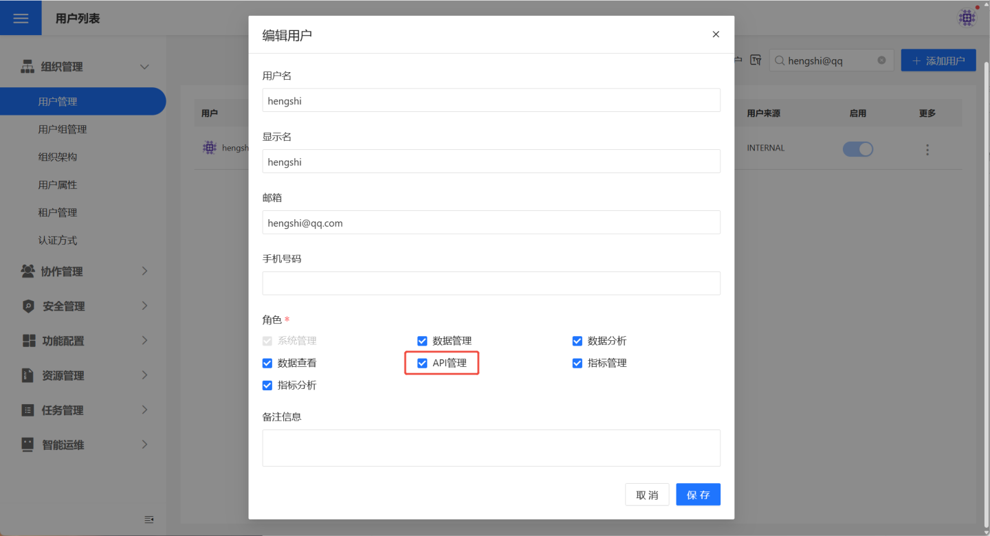 API 服务功能是将数据服务化,通过 API 接口将系统中数据连接数据、数据集数据、图表数据提供给用户使用。您可以通过给用户赋予API 管理角色授权该用户使用 API 服务的管理权限。