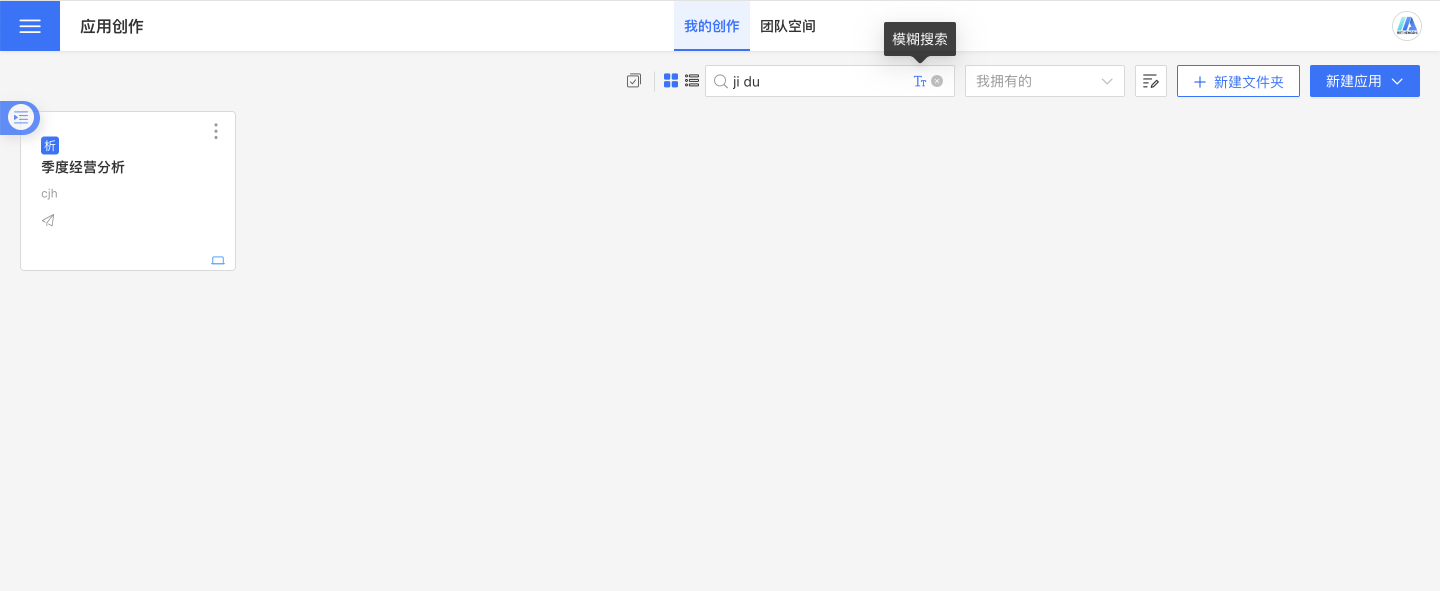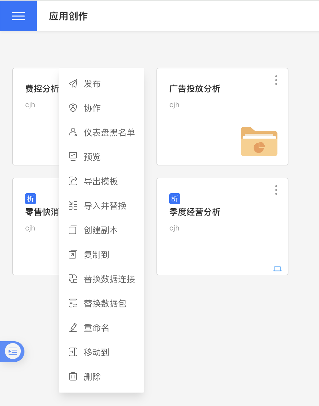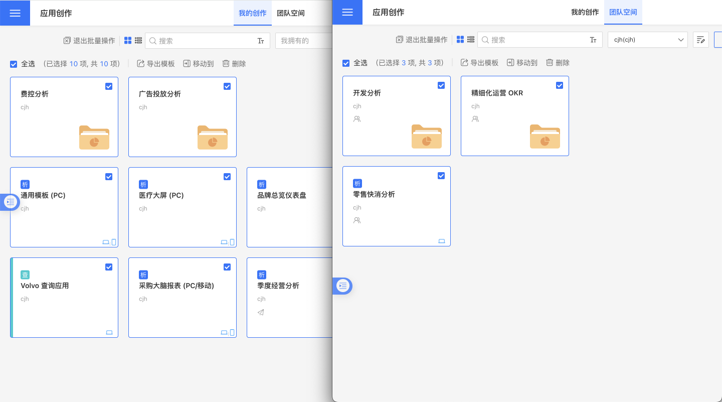- 我的创作:是个人创作区域,每个具有数据分析的角色的用户都拥有该空间,能够在该空间进行应用创作