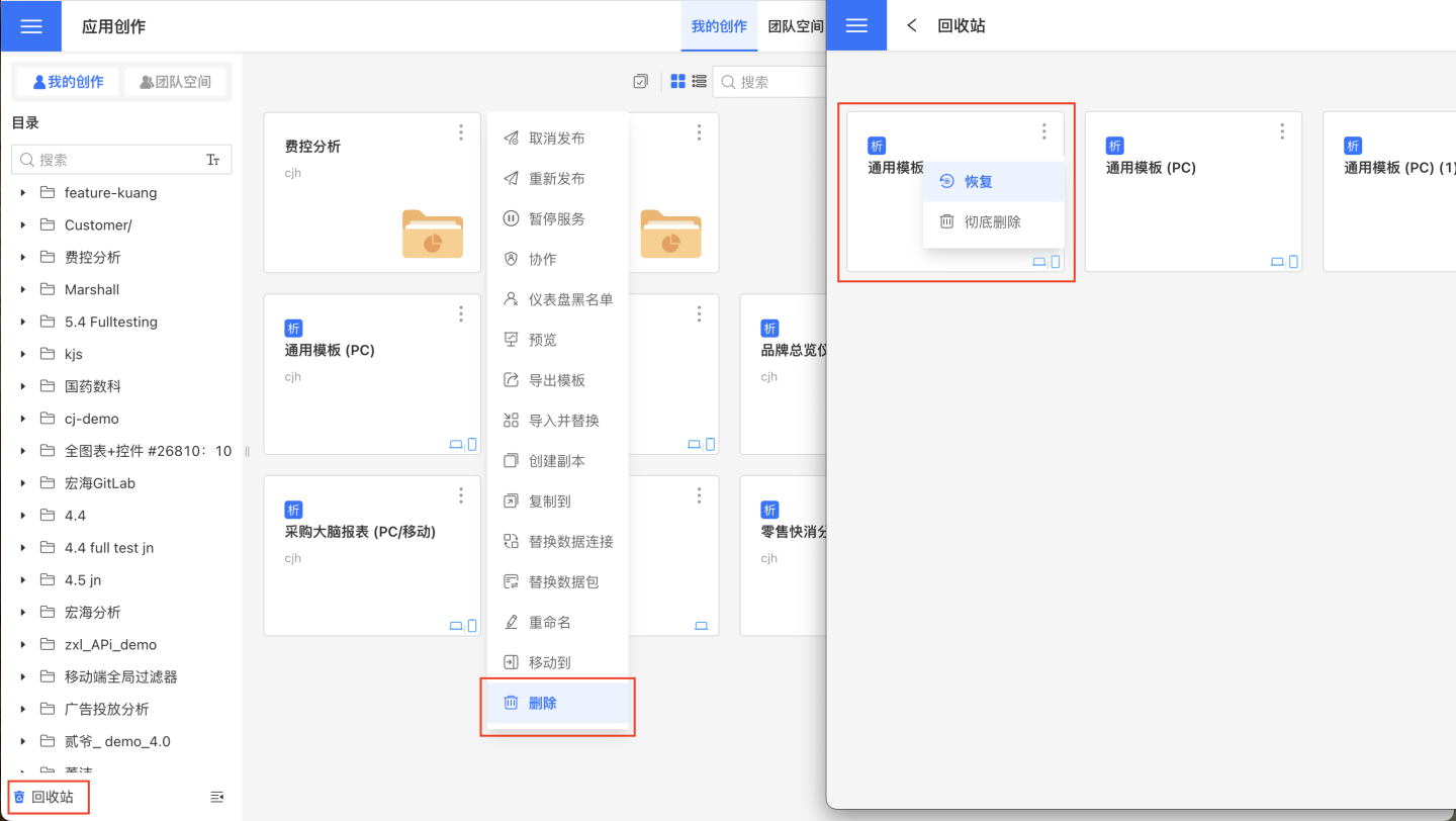 回收站中存放的应用可以进行恢复,也可以彻底删除。我的创作和团队空间有各自的回收站,点击空间对应的下拉标识进入到相应的回收站。