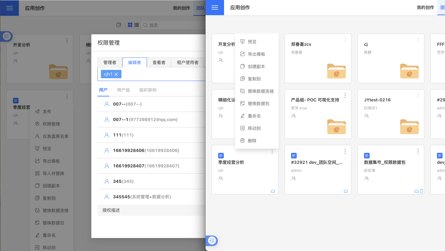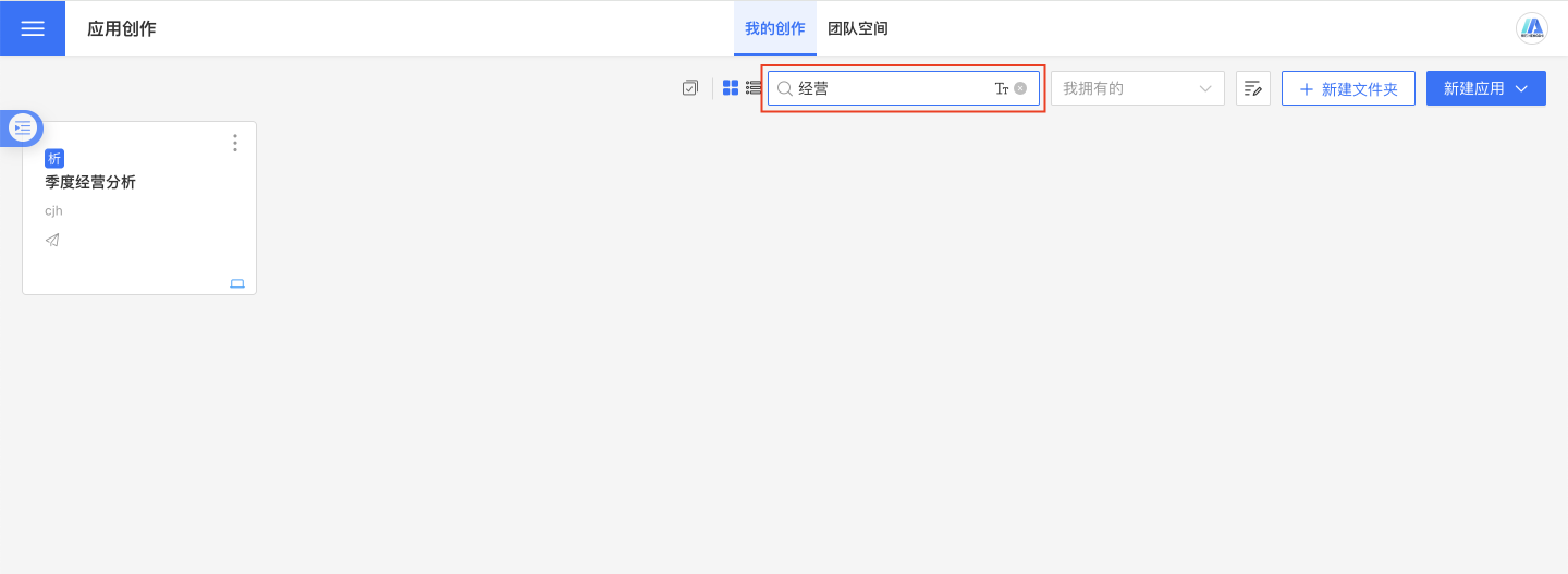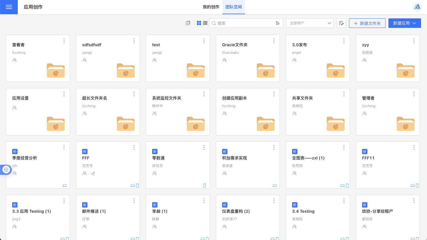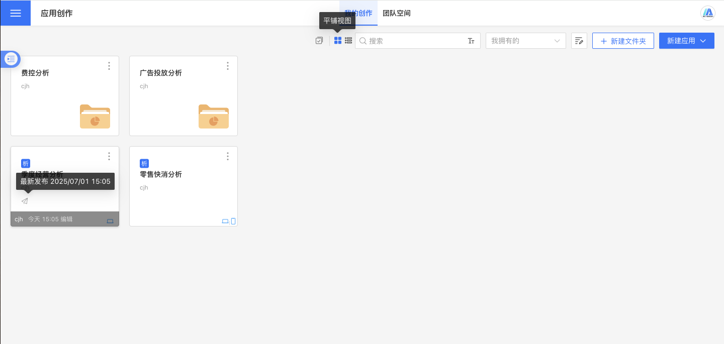 应用创作是整个应用管理与开发的核心工作区域,用户可以在这里创建、管理和协作开发各种数据分析应用。本文档将详细介绍应用创作的完整功能体系。