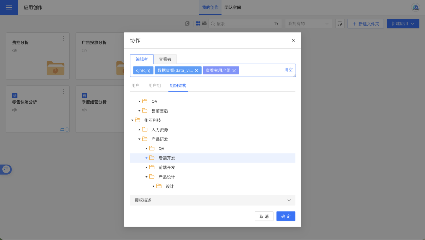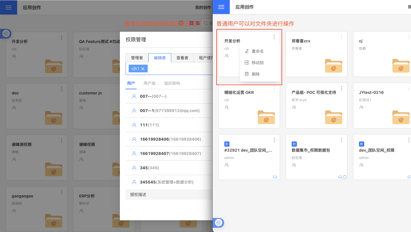 应用协作操作简单,点击文件夹或应用的三点菜单中的协作,在弹窗中设置协作用户,设置协作操作内容,点击确定,完成协作操作。协作时可在授权描述中说明协作原因、内容等信息,便于后续跟踪。