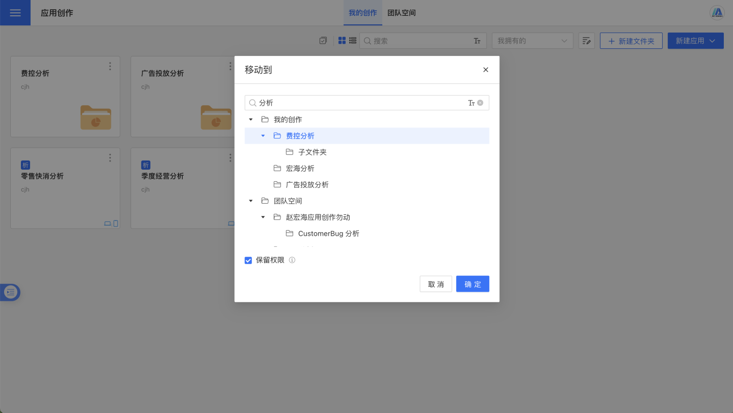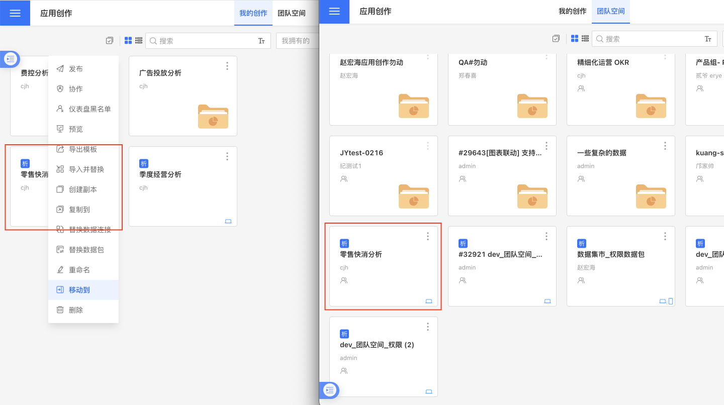 在我的创作中点击应用右侧的三点菜单移动,弹窗中选择移动到团队空间。应用从我的创作移动到团队空间后,变成团队空间的应用,遵守团队空间的属性,由管理员和授权的用户进行操作。