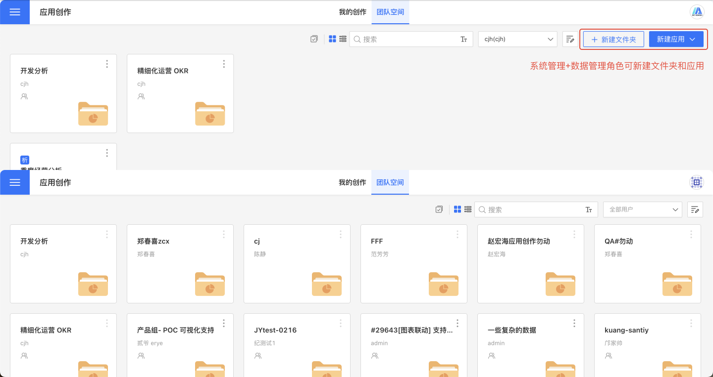 团队空间中管理员必须具有系统管理、数据管理和数据分析三个角色的用户。管理员在团队空间中新建文件夹或应用,并且通过对文件夹和应用设置权限让授权的用户使用应用及其数据。